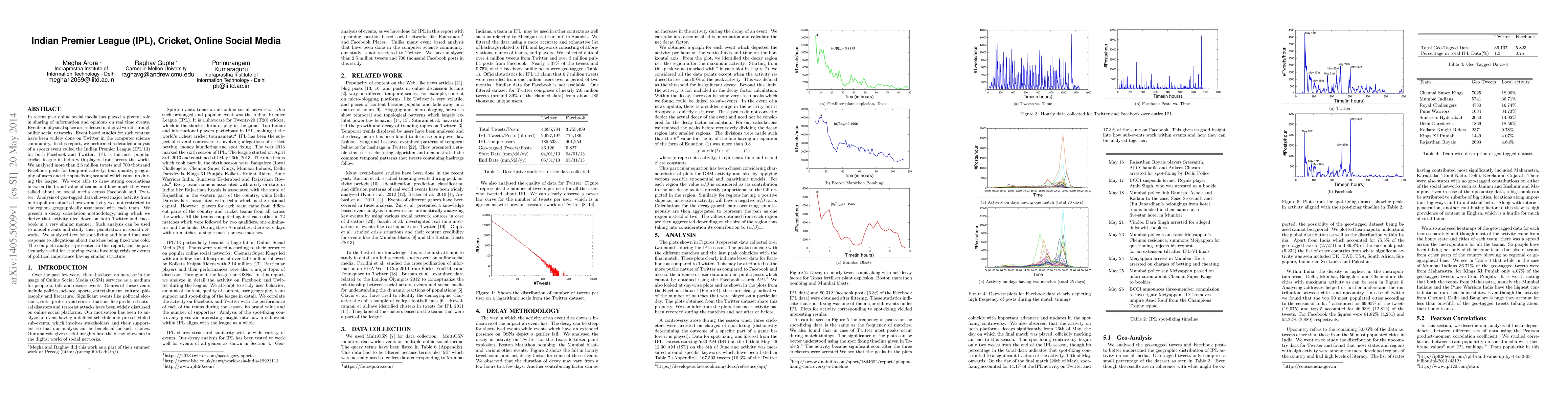 This study analyzes the online social media discourse surrounding the 2013 Indian Premier League (IPL) on Facebook and Twitter, examining over 2.6 million tweets and 700,000 Facebook posts to assess temporal activity, user geography, and the impact of a spot-fixing scandal. The research reveals strong correlations between team brand value and social media engagement, and suggests a similar decay pattern for online activity on both platforms.