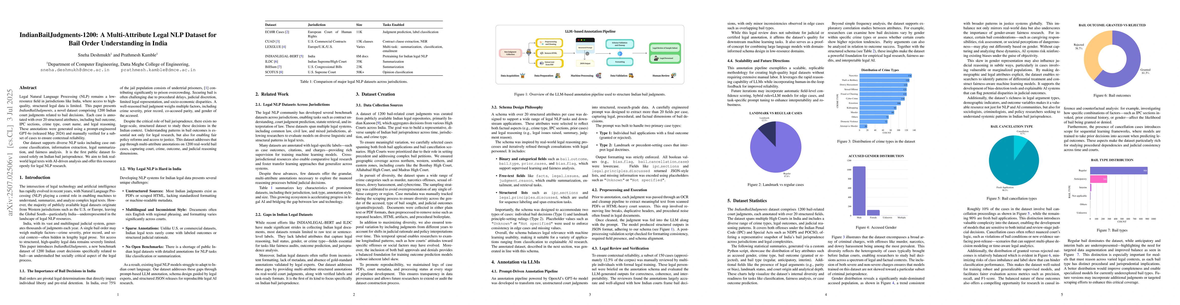 Legal NLP remains underdeveloped in regions like India due to the scarcity of structured datasets. We introduce IndianBailJudgments-1200, a new benchmark dataset comprising 1200 Indian court judgments on bail decisions, annotated across 20+ attributes including bail outcome, IPC sections, crime type, and legal reasoning. Annotations were generated using a prompt-engineered GPT-4o pipeline and verified for consistency. This resource supports a wide range of legal NLP tasks such as outcome prediction, summarization, and fairness analysis, and is the first publicly available dataset focused specifically on Indian bail jurisprudence.