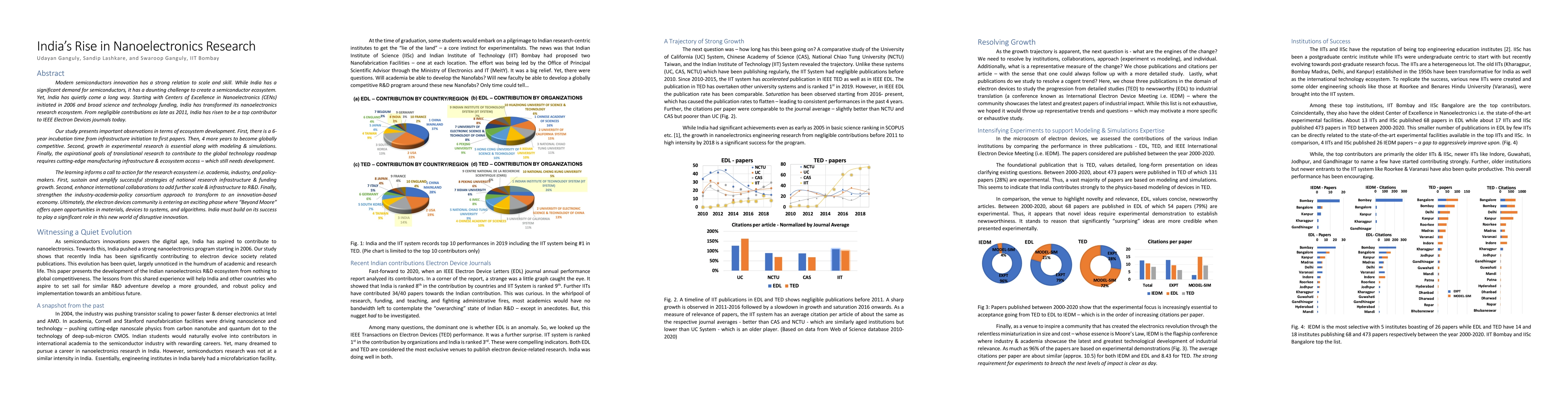 Modern semiconductors innovation has a strong relation to scale and skill. While India has a significant demand for semiconductors, it has a daunting challenge to create a semiconductor ecosystem. Yet, India has quietly come a long way. Starting with Centers of Excellence in Nanoelectronics (CENs) initiated in 2006 and broad science and technology funding, India has transformed its nanoelectronics research ecosystem. From negligible contributions as late as 2011, India has risen to be a top contributor to IEEE Electron Devices journals today. Our study presents important observations in terms of ecosystem development. First, there is a 6 year incubation time from infrastructure initiation to first papers. Then, 4 more years to become globally competitive. Second, growth in experimental research is essential along with modeling & simulations. Finally, the aspirational goals of translational research to contribute to the global technology roadmap requires cutting-edge manufacturing infrastructure & ecosystem access, which still needs development. The learning informs a call to action for the research ecosystem i.e. academia, industry, and policy-makers. First, sustain and amplify successful strategies of national research infrastructure & funding growth. Second, enhance international collaborations to add further scale & infrastructure to R&D. Finally, strengthen the industry-academia-policy consortium approach to transform to an innovation-based economy. Ultimately, the electron devices community is entering an exciting phase where Beyond Moore offers open opportunities in materials, devices to systems, and algorithms. India must build on its success to play a significant role in this new world of disruptive innovation.