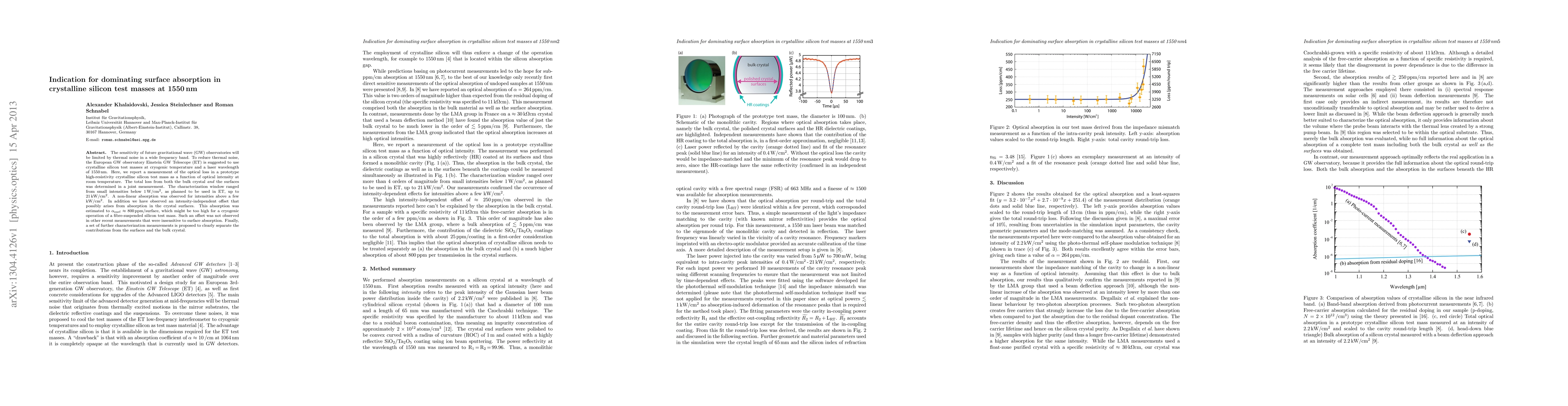 This study examines optical loss in a crystalline silicon prototype for future GW detectors, using a 1550nm laser. Key findings include non-linear absorption at high intensities and an intensity-independent surface absorption of approximately 800 ppm/surface, potentially problematic for cryogenic operation. The research proposes further tests to isolate surface and bulk crystal contributions.