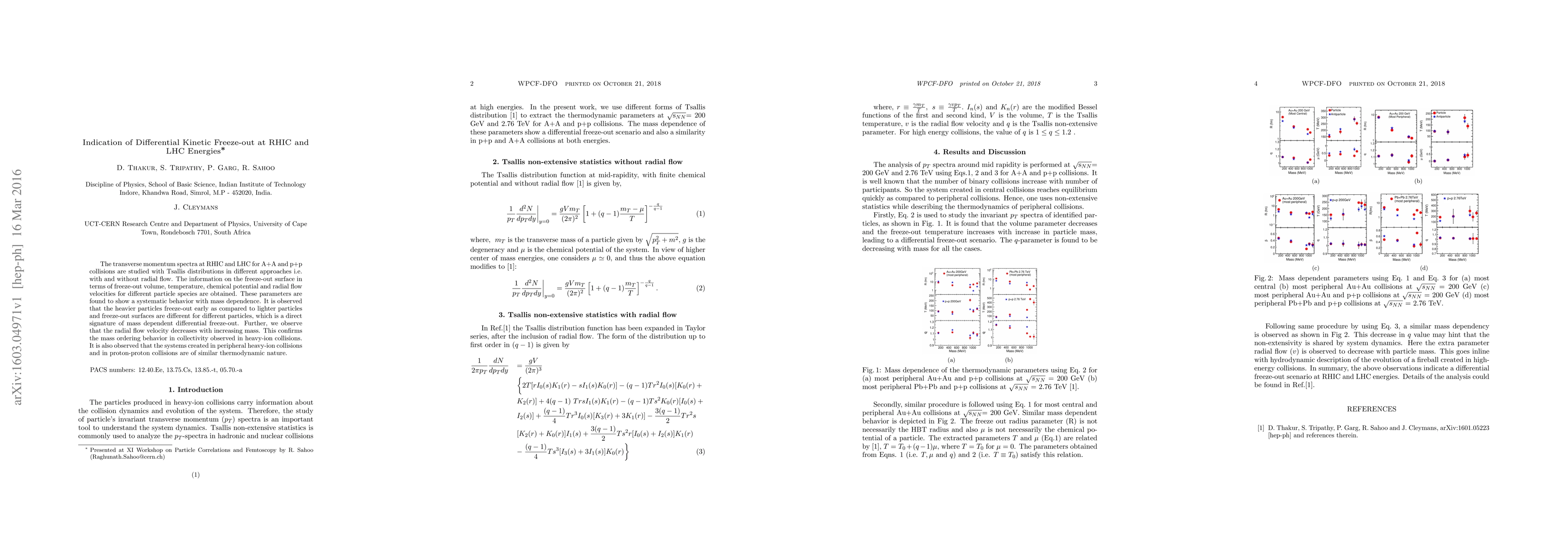 The transverse momentum spectra at RHIC and LHC for A+A and p+p collisions are studied with Tsallis distributions in different approaches i.e. with and without radial flow. The information on the freeze-out surface in terms of freeze-out volume, temperature, chemical potential and radial flow velocities for different particle species are obtained. These parameters are found to show a systematic behavior with mass dependence. It is observed that the heavier particles freeze-out early as compared to lighter particles and freeze-out surfaces are different for different particles, which is a direct signature of mass dependent differential freeze-out. Further, we observe that the radial flow velocity decreases with increasing mass. This confirms the mass ordering behavior in collectivity observed in heavy-ion collisions. It is also observed that the systems created in peripheral heavy-ion collisions and in proton-proton collisions are of similar thermodynamic nature.