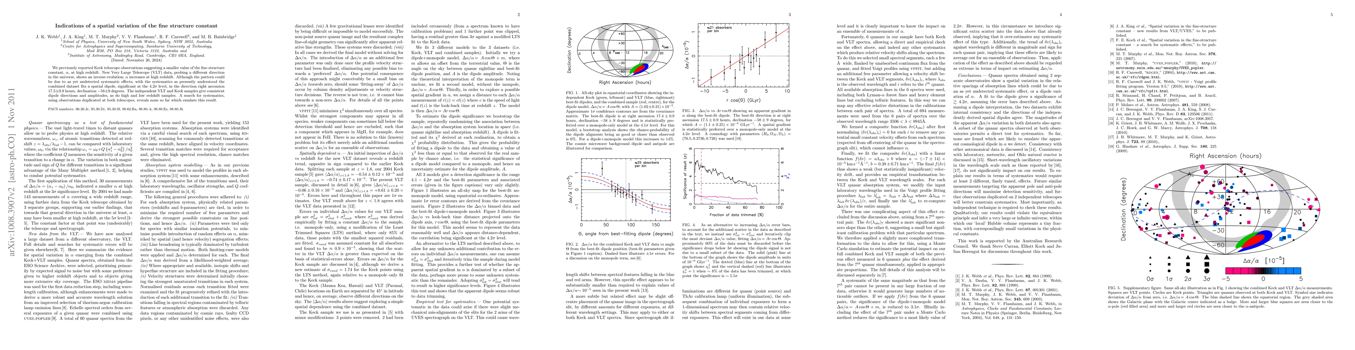 We previously reported Keck telescope observations suggesting a smaller value of the fine structure constant, alpha, at high redshift. New Very Large Telescope (VLT) data, probing a different direction in the universe, shows an inverse evolution; alpha increases at high redshift. Although the pattern could be due to as yet undetected systematic effects, with the systematics as presently understood the combined dataset fits a spatial dipole, significant at the 4.2-sigma level, in the direction right ascension 17.5 +/- 0.9 hours, declination -58 +/- 9 degrees. The independent VLT and Keck samples give consistent dipole directions and amplitudes, as do high and low redshift samples. A search for systematics, using observations duplicated at both telescopes, reveals none so far which emulate this result.