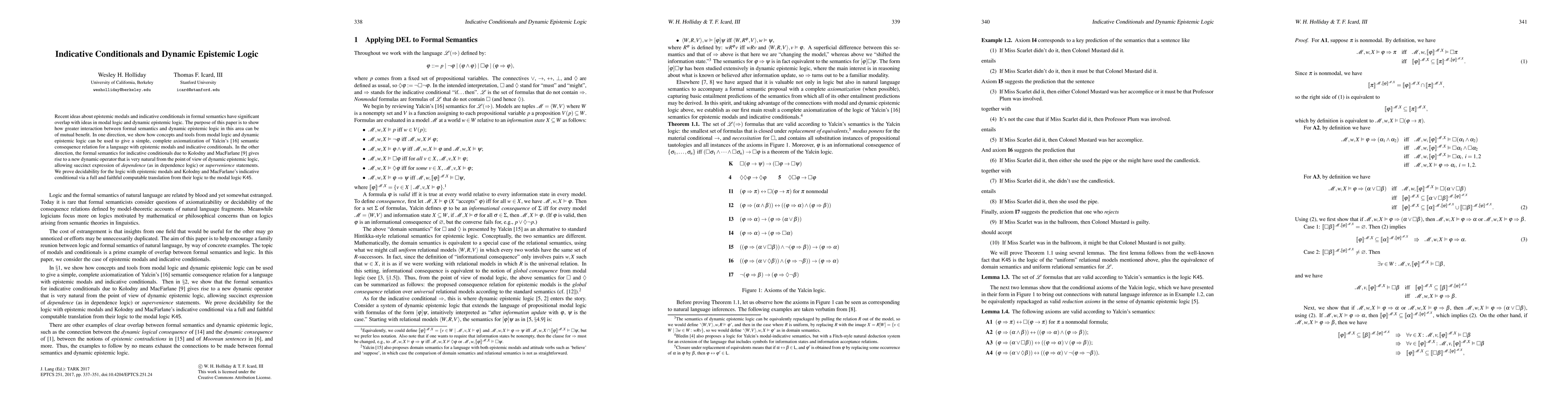 Recent ideas about epistemic modals and indicative conditionals in formal semantics have significant overlap with ideas in modal logic and dynamic epistemic logic. The purpose of this paper is to show how greater interaction between formal semantics and dynamic epistemic logic in this area can be of mutual benefit. In one direction, we show how concepts and tools from modal logic and dynamic epistemic logic can be used to give a simple, complete axiomatization of Yalcin's [16] semantic consequence relation for a language with epistemic modals and indicative conditionals. In the other direction, the formal semantics for indicative conditionals due to Kolodny and MacFarlane [9] gives rise to a new dynamic operator that is very natural from the point of view of dynamic epistemic logic, allowing succinct expression of dependence (as in dependence logic) or supervenience statements. We prove decidability for the logic with epistemic modals and Kolodny and MacFarlane's indicative conditional via a full and faithful computable translation from their logic to the modal logic K45.
