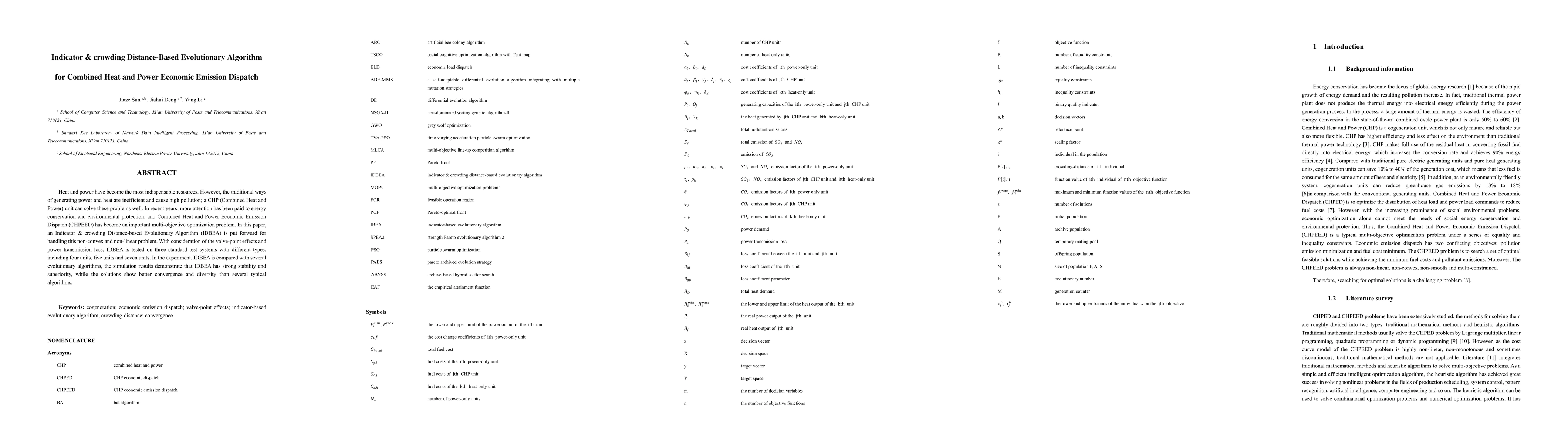 This paper proposes an Indicator & crowding Distance-based Evolutionary Algorithm (IDBEA) for solving the Combined Heat and Power Economic Emission Dispatch (CHPEED) problem, which optimizes energy efficiency and reduces pollution. IDBEA demonstrates strong stability and superior performance compared to other evolutionary algorithms in tests on three standard systems, showing better convergence and diversity.