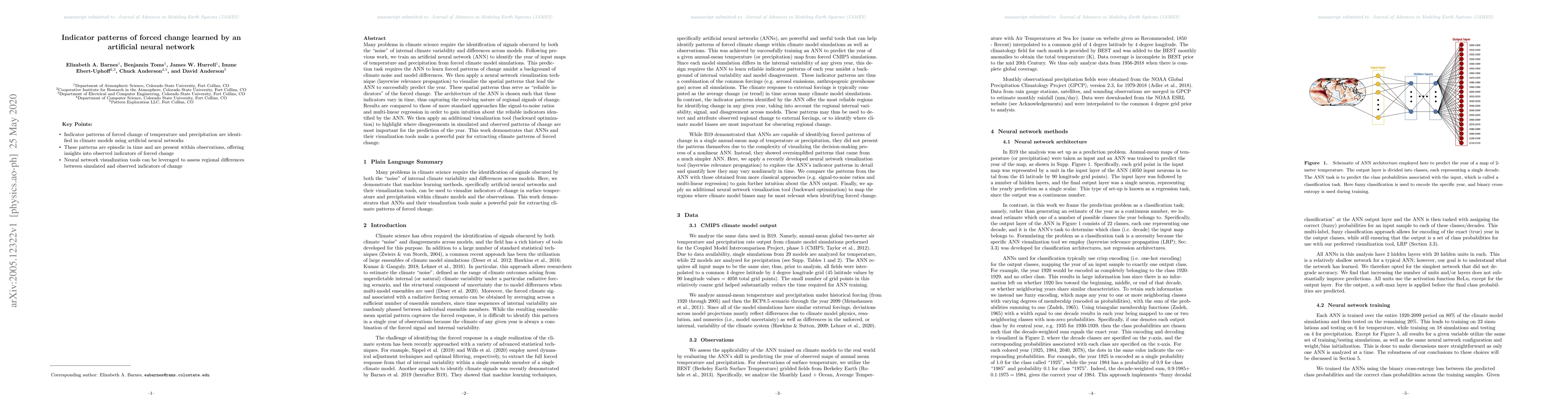 Many problems in climate science require the identification of signals obscured by both the "noise" of internal climate variability and differences across models. Following previous work, we train an artificial neural network (ANN) to identify the year of input maps of temperature and precipitation from forced climate model simulations. This prediction task requires the ANN to learn forced patterns of change amidst a background of climate noise and model differences. We then apply a neural network visualization technique (layerwise relevance propagation) to visualize the spatial patterns that lead the ANN to successfully predict the year. These spatial patterns thus serve as "reliable indicators" of the forced change. The architecture of the ANN is chosen such that these indicators vary in time, thus capturing the evolving nature of regional signals of change. Results are compared to those of more standard approaches like signal-to-noise ratios and multi-linear regression in order to gain intuition about the reliable indicators identified by the ANN. We then apply an additional visualization tool (backward optimization) to highlight where disagreements in simulated and observed patterns of change are most important for the prediction of the year. This work demonstrates that ANNs and their visualization tools make a powerful pair for extracting climate patterns of forced change.