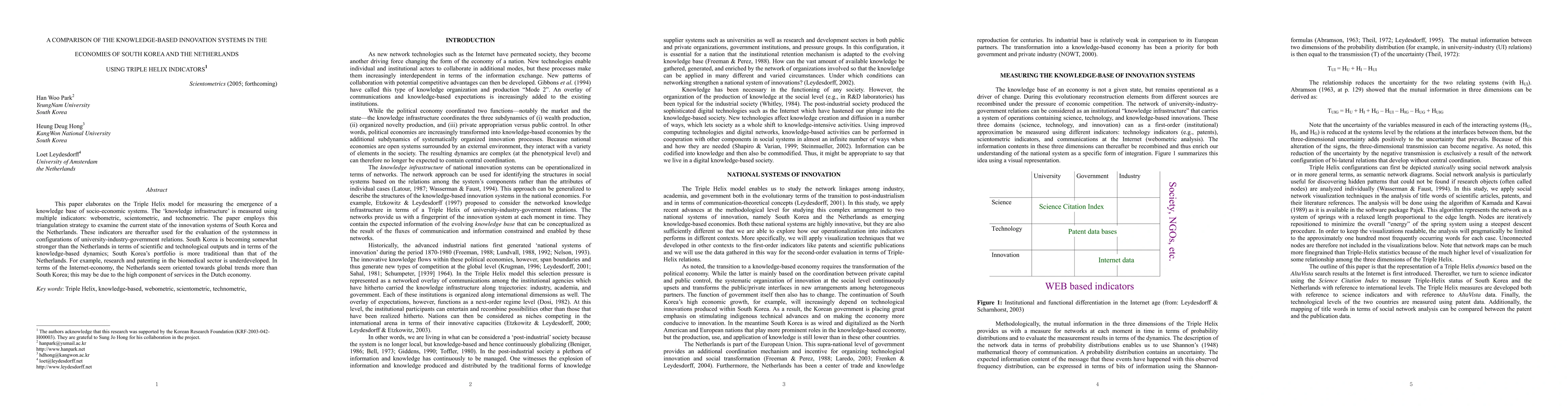 This paper uses the Triple Helix model to compare South Korea and the Netherlands' innovation systems through webometric, scientometric, and technometric indicators. South Korea shows stronger scientific and technological outputs but lags in biomedical sectors, while the Netherlands excels in the Internet-economy due to its service-oriented economy.