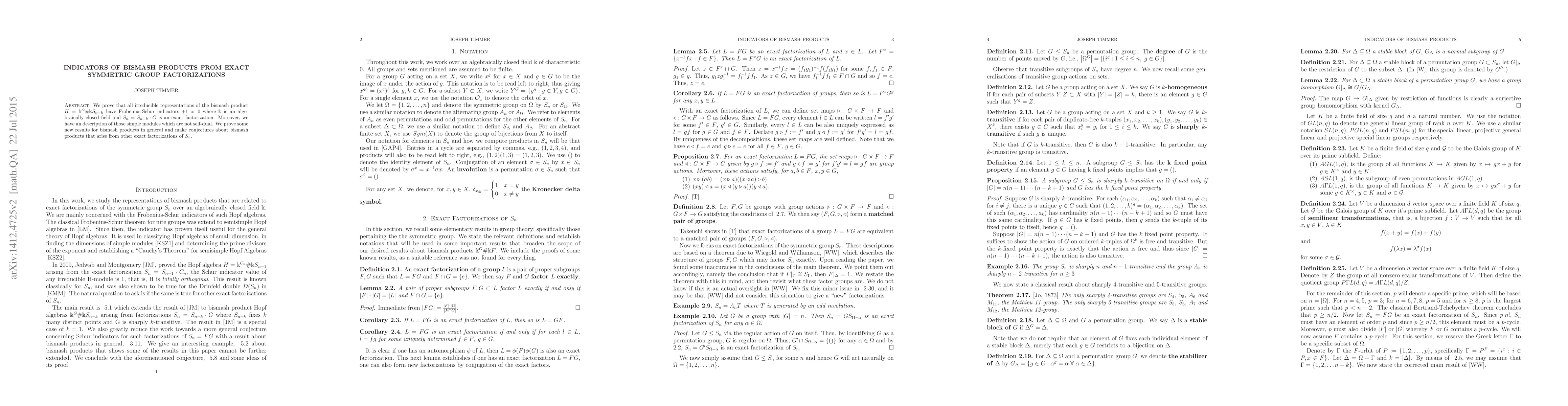 We prove that all irreducible representations of the bismash product $H = \mathbb{k} ^G \# \mathbb{k} S_{n-k}$ have Frobenius-Schur indicators +1 or 0 where $\mathbb{k}$ is an algebraically closed field and $S_n = S_{n-k}\cdot G$ is an exact factorization. Moreover, we have an description of those simple modules which are not self-dual. We prove some new results for bismash products in general and make conjectures about bismash products that arise from other exact factorizations of $S_n$.