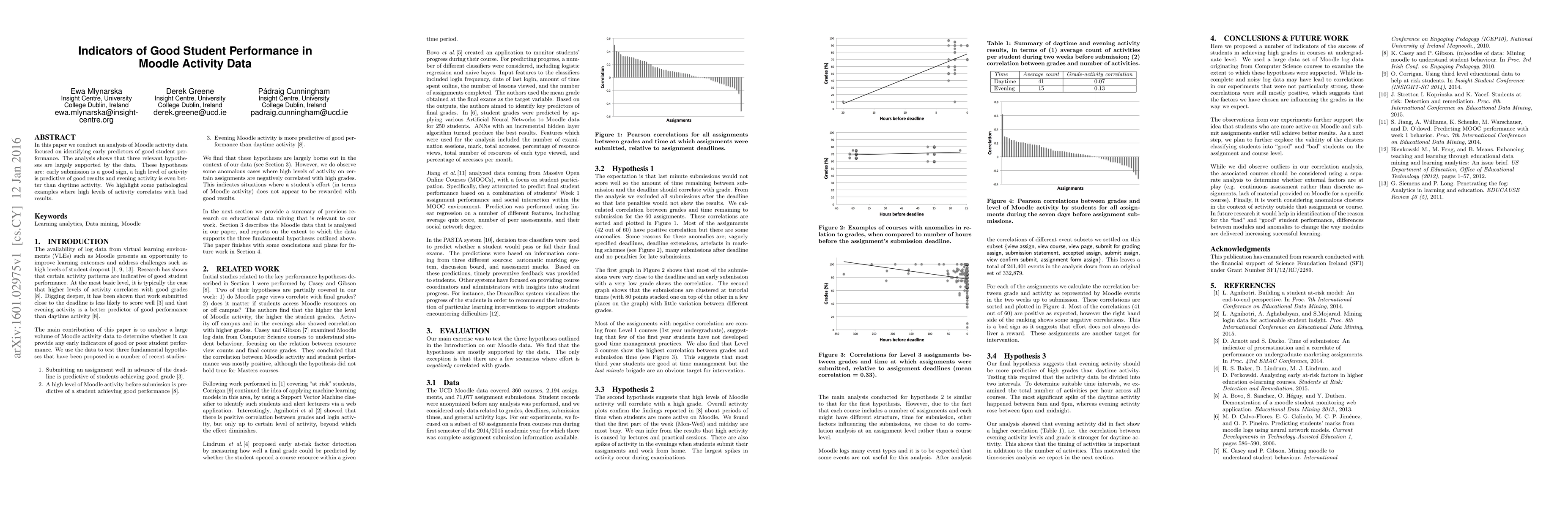 This study analyzes Moodle activity data to identify early predictors of good student performance, finding that early submissions, high activity levels, and evening activity are largely supported as positive indicators, though it also notes exceptions where high activity correlates with poor results.