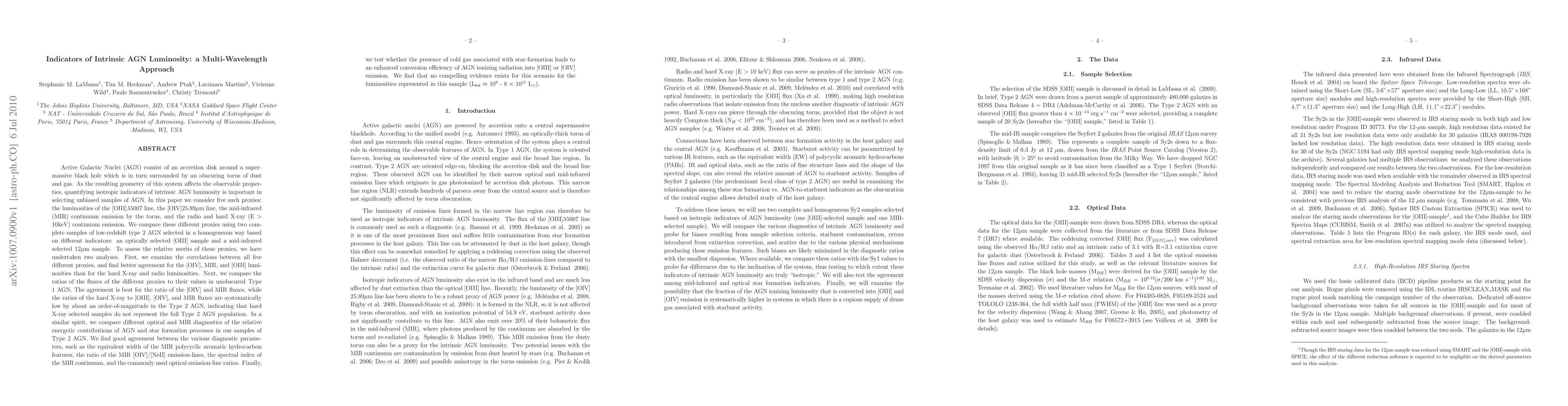 We consider five indicators for intrinsic AGN luminosity: the luminosities of the [OIII]$\lambda$5007 line, the [OIV]25.89$\mu$m line, the mid-infrared (MIR) continuum emission by the torus, and the radio and hard X-ray (E $>$ 10keV) continuum emission. We compare these different proxies using two complete samples of low-redshift type 2 AGN selected in a homogeneous way based on different indicators: an optically selected [OIII] sample and a mid-infrared selected 12$\mu$m sample. We examine the correlations between all five different proxies, and find better agreement for the [OIV], MIR, and [OIII] luminosities than for the hard X-ray and radio luminosities. Next, we compare the ratios of the fluxes of the different proxies to their values in unobscured Type 1 AGN. The agreement is best for the ratio of the [OIV] and MIR fluxes, while the ratios of the hard X-ray to [OIII], [OIV], and MIR fluxes are systematically low by about an order-of-magnitude in the Type 2 AGN, indicating that hard X-ray selected samples do not represent the full Type 2 AGN population. In a similar spirit, we compare different optical and MIR diagnostics of the relative energetic contributions of AGN and star formation processes in our samples of Type 2 AGN. We find good agreement between the various diagnostic parameters, such as the equivalent width of the MIR polycyclic aromatic hydrocarbon features, the ratio of the MIR [OIV]/[NeII] emission-lines, the spectral index of the MIR continuum, and the commonly used optical emission-line ratios. Finally, we test whether the presence of cold gas associated with star-formation leads to an enhanced conversion efficiency of AGN ionizing radiation into [OIII] or [OIV] emission. We find that no compelling evidence exists for this scenario for the luminosities represented in this sample (L$_{bol}$ $\approx$ 10$^{9}$ - 8 $\times$ 10$^{11}$ L$_{\sun}$). (abridged)