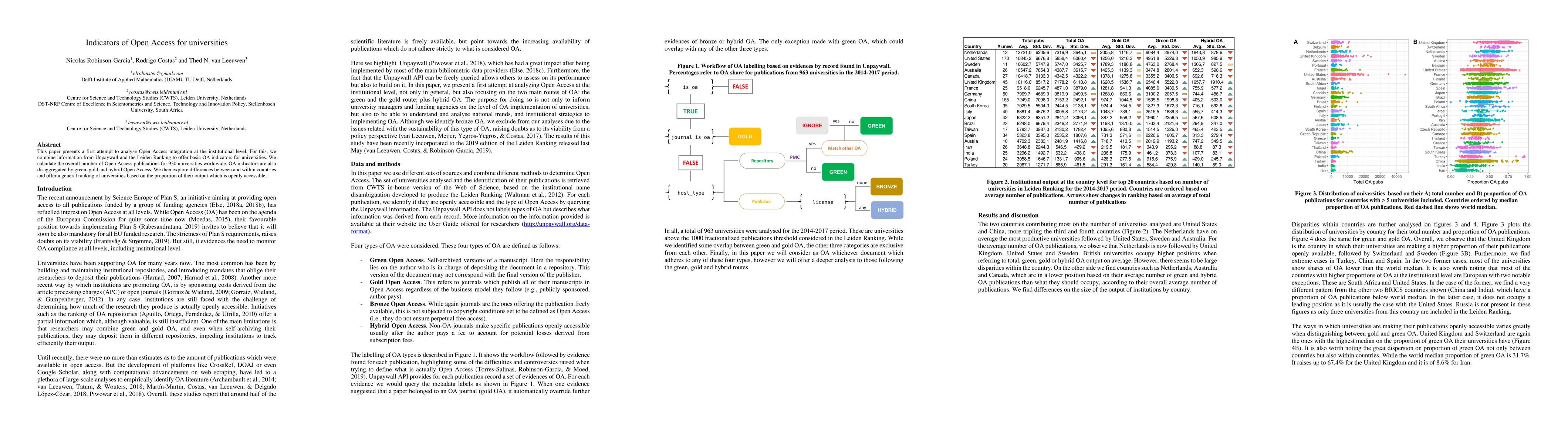 This paper develops basic Open Access (OA) indicators for 930 universities worldwide by combining Unpaywall and Leiden Ranking data, analyzing the proportion of OA publications across green, gold, and hybrid models, and ranking universities based on their OA output. It explores differences in OA integration between and within countries.