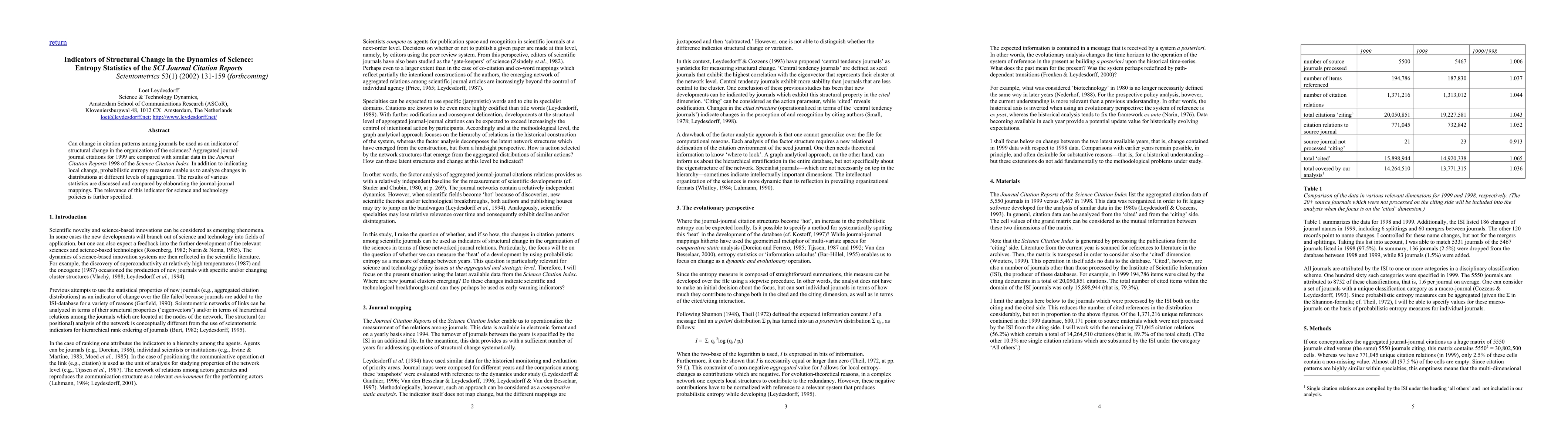 This paper examines whether shifts in journal-to-journal citation patterns can signal structural changes in the organization of science. It uses entropy statistics from the SCI Journal Citation Reports to analyze changes in citation distributions, discussing their implications for science and technology policy.