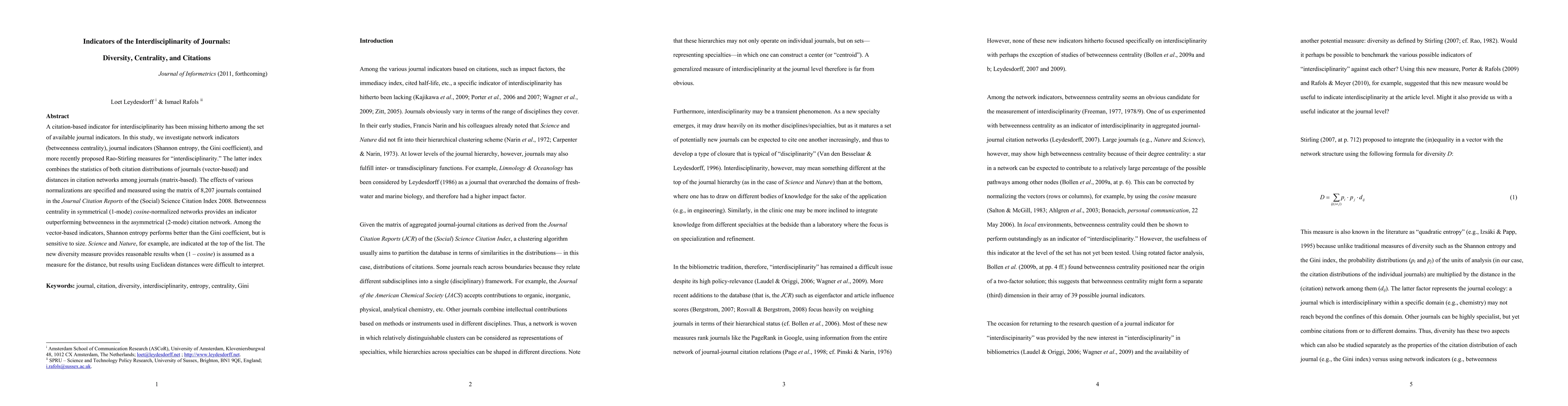 A citation-based indicator for interdisciplinarity has been missing hitherto among the set of available journal indicators. In this study, we investigate network indicators (betweenness centrality), journal indicators (Shannon entropy, the Gini coefficient), and more recently proposed Rao-Stirling measures for "interdisciplinarity." The latter index combines the statistics of both citation distributions of journals (vector-based) and distances in citation networks among journals (matrix-based). The effects of various normalizations are specified and measured using the matrix of 8,207 journals contained in the Journal Citation Reports of the (Social) Science Citation Index 2008. Betweenness centrality in symmetrical (1-mode) cosine-normalized networks provides an indicator outperforming betweenness in the asymmetrical (2-mode) citation network. Among the vector-based indicators, Shannon entropy performs better than the Gini coefficient, but is sensitive to size. Science and Nature, for example, are indicated at the top of the list. The new diversity measure provides reasonable results when (1 - cosine) is assumed as a measure for the distance, but results using Euclidean distances were difficult to interpret.