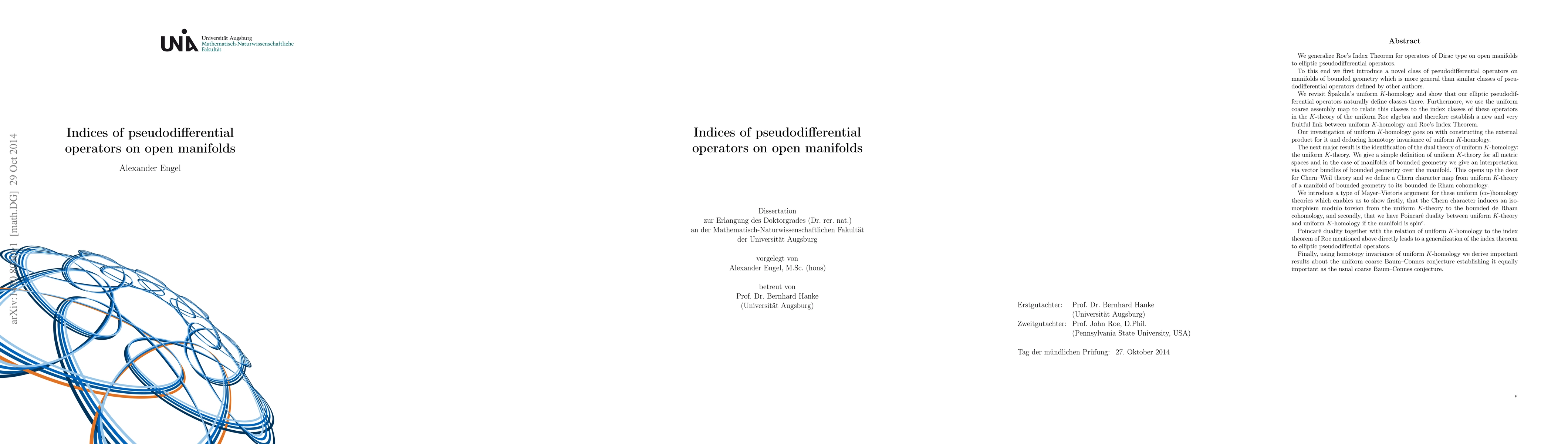 We generalize Roe's Index Theorem for operators of Dirac type on open manifolds to elliptic pseudodifferential operators. To this end we introduce a class of pseudodifferential operators on manifolds of bounded geometry which is more general than similar classes defined by other authors. We revisit Spakula's uniform K-homology and show that our elliptic pseudodifferential operators naturally define classes there. Furthermore, we use the uniform coarse assembly map to relate these classes to the index classes of these operators in the K-theory of the uniform Roe algebra. Our investigation of uniform K-homology goes on with constructing the external product for it and deducing homotopy invariance. The next major result is the identification of the dual theory of uniform K-homology: uniform K-theory. We give a simple definition of uniform K-theory for all metric spaces and in the case of manifolds of bounded geometry we give an interpretation via vector bundles of bounded geometry over the manifold. This opens up the door for Chern-Weil theory and we define a Chern character map from uniform K-theory of a manifold to its bounded de Rham cohomology. We introduce a type of Mayer-Vietoris argument for these uniform (co-)homology theories which enables us to show firstly, that the Chern character induces an isomorphism modulo torsion, and secondly, that we have Poincare duality between uniform K-theory and uniform K-homology if the manifold is spin-c. Poincare duality together with the relation of uniform K-homology to the index theorem of Roe mentioned above directly leads to a generalization of the index theorem to elliptic pseudodiffential operators. Finally, using homotopy invariance of uniform K-homology we derive important results about the uniform coarse Baum-Connes conjecture establishing it equally important as the usual coarse Baum-Connes conjecture.