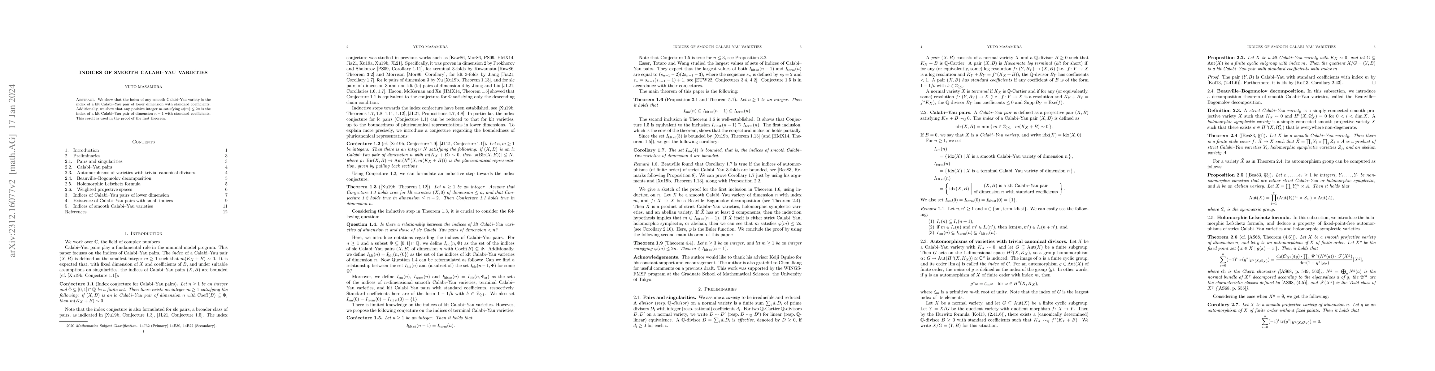 Summary: This paper demonstrates that the index of any smooth Calabi-Yau variety corresponds to a lower-dimensional klt Calabi-Yau pair with standard coefficients. It also establishes that any positive integer $m$ with $\varphi(m)\le 2n$ can be the index of a klt Calabi-Yau pair of dimension $n-1$ with standard coefficients.