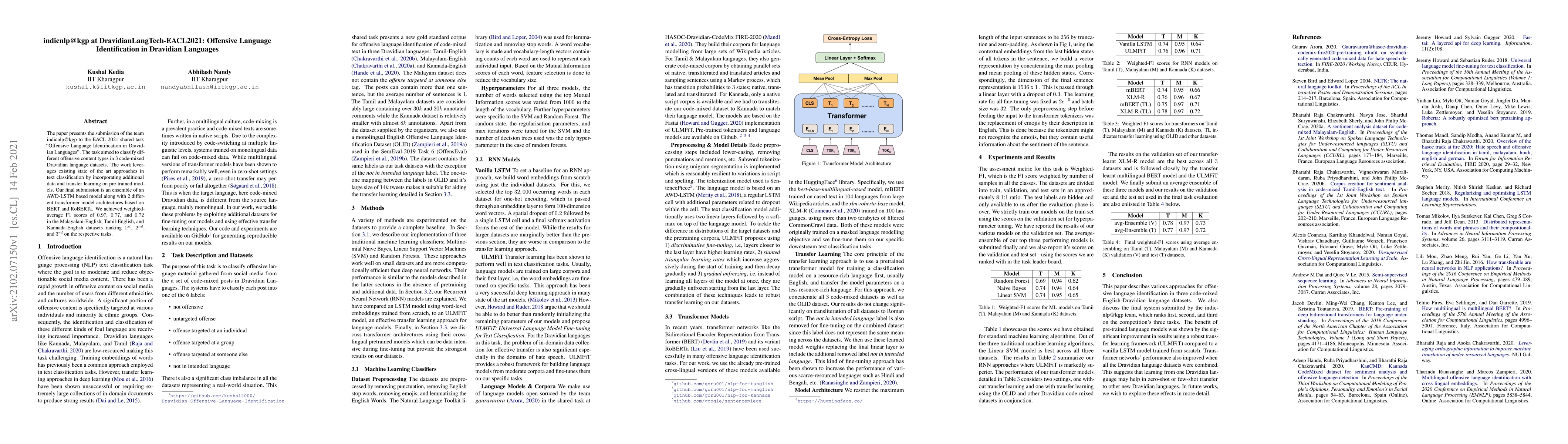The paper presents the submission of the team indicnlp@kgp to the EACL 2021 shared task "Offensive Language Identification in Dravidian Languages." The task aimed to classify different offensive content types in 3 code-mixed Dravidian language datasets. The work leverages existing state of the art approaches in text classification by incorporating additional data and transfer learning on pre-trained models. Our final submission is an ensemble of an AWD-LSTM based model along with 2 different transformer model architectures based on BERT and RoBERTa. We achieved weighted-average F1 scores of 0.97, 0.77, and 0.72 in the Malayalam-English, Tamil-English, and Kannada-English datasets ranking 1st, 2nd, and 3rd on the respective tasks.