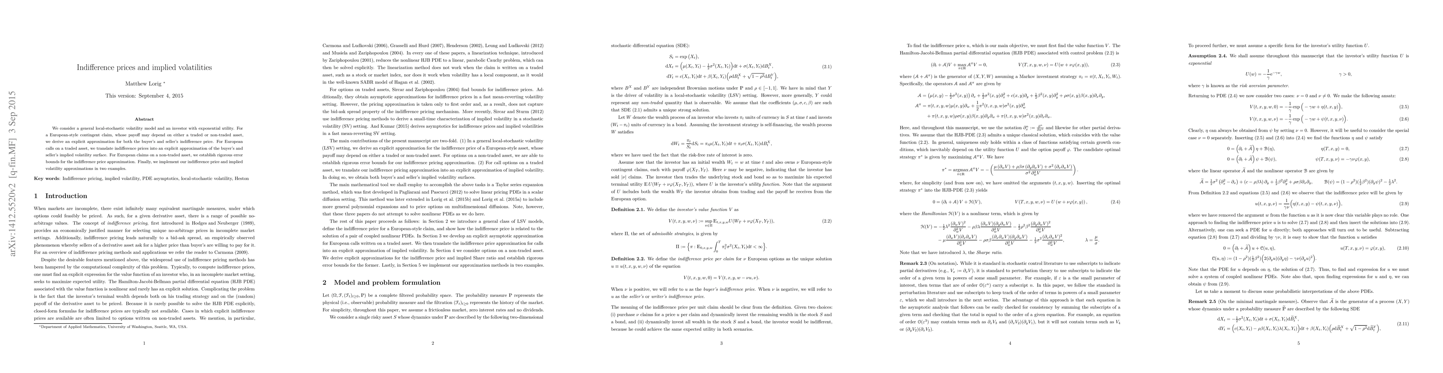 We consider a general local-stochastic volatility model and an investor with exponential utility. For a European-style contingent claim, whose payoff may depend on either a traded or non-traded asset, we derive an explicit approximation for both the buyer's and seller's indifference price. For European calls on a traded asset, we translate indifference prices into an explicit approximation of the buyer's and seller's implied volatility surface. For European claims on a non-traded asset, we establish rigorous error bounds for the indifference price approximation. Finally, we implement our indifference price and implied volatility approximations in two examples.