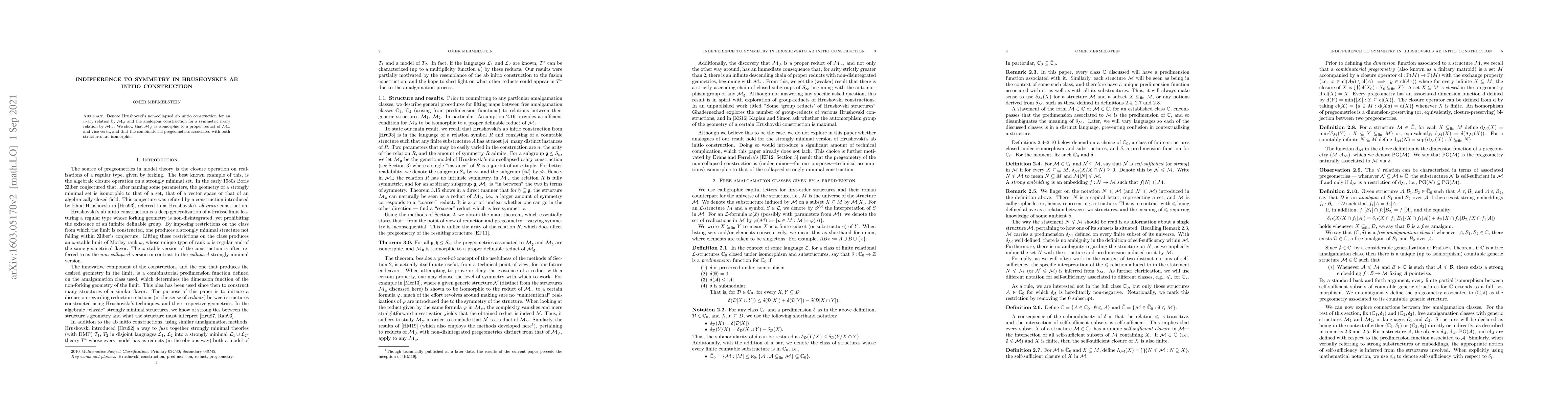 Denote Hrushovski's non-collapsed ab initio construction for an $n$-ary relation by $\mathcal{M}_{\not\sim}$ and the analogous construction for a symmetric $n$-ary relation by $\mathcal{M}_{\sim}$. We show that $\mathcal{M}_{\not\sim}$ is isomorphic to a proper reduct of $\mathcal{M}_{\sim}$ and vice versa, and that the combinatorial pregeometries associated with both structures are isomorphic.
