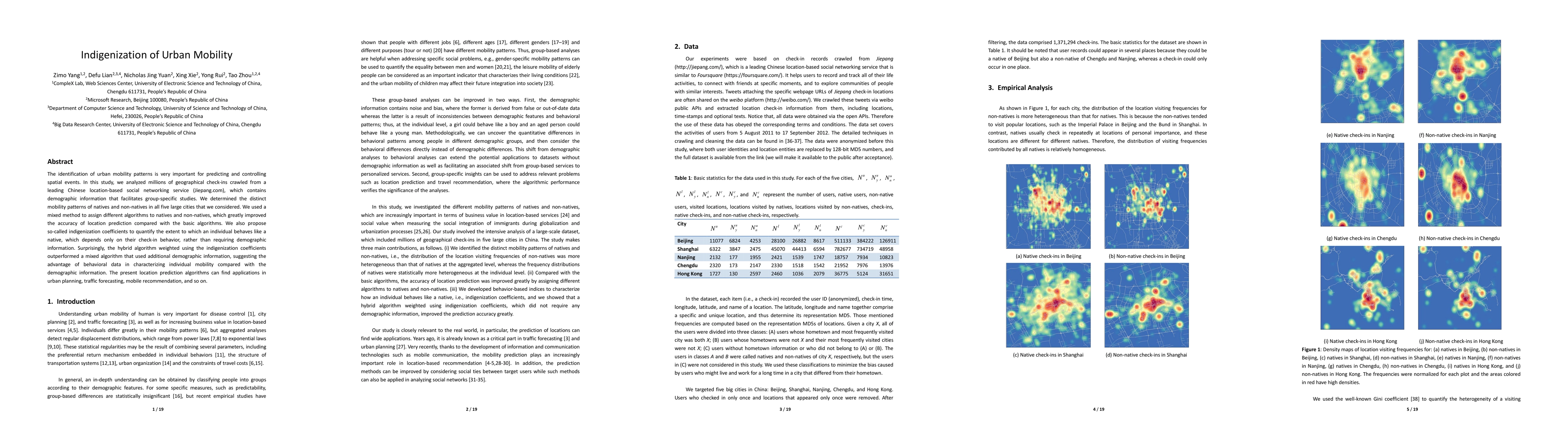 The identification of urban mobility patterns is very important for predicting and controlling spatial events. In this study, we analyzed millions of geographical check-ins crawled from a leading Chinese location-based social networking service (Jiepang.com), which contains demographic information that facilitates group-specific studies. We determined the distinct mobility patterns of natives and non-natives in all five large cities that we considered. We used a mixed method to assign different algorithms to natives and non-natives, which greatly improved the accuracy of location prediction compared with the basic algorithms. We also propose so-called indigenization coefficients to quantify the extent to which an individual behaves like a native, which depends only on their check-in behavior, rather than requiring demographic information. Surprisingly, the hybrid algorithm weighted using the indigenization coefficients outperformed a mixed algorithm that used additional demographic information, suggesting the advantage of behavioral data in characterizing individual mobility compared with the demographic information. The present location prediction algorithms can find applications in urban planning, traffic forecasting, mobile recommendation, and so on.