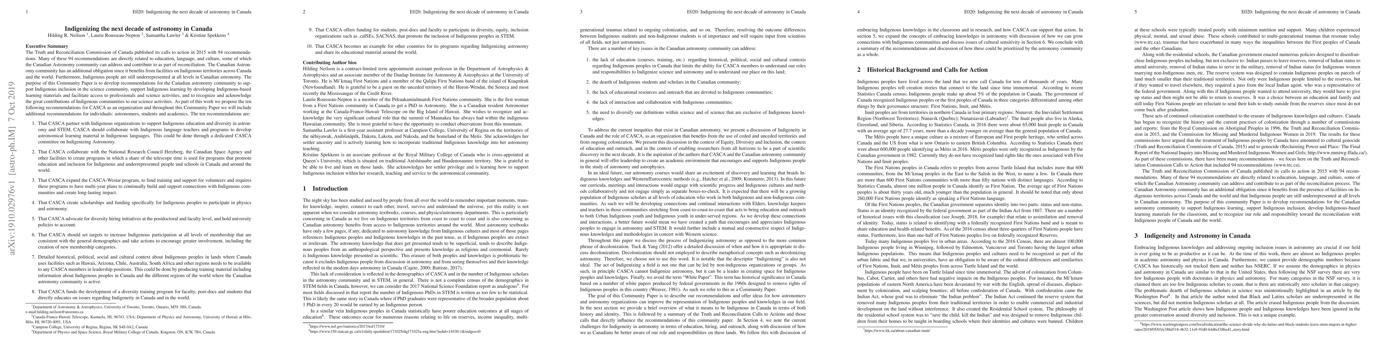 The Canadian Astronomy community is called upon to address Indigenous inclusion in astronomy, develop Indigenous-based learning materials, and recognize the contributions of Indigenous communities. Recommendations aim to increase diversity and support reconciliation through education, language, and culture.