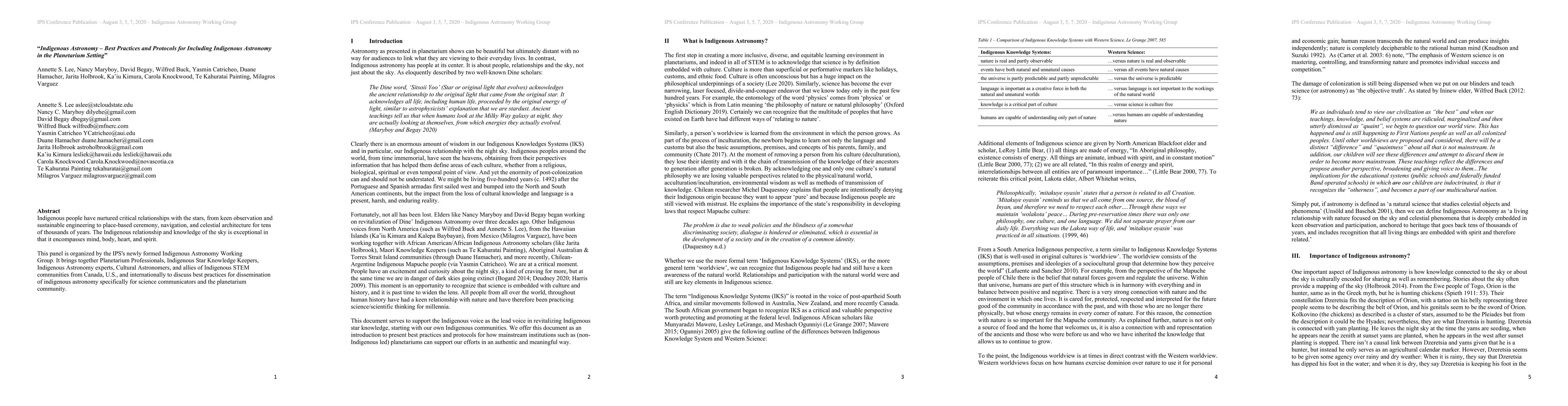 Indigenous people have nurtured critical relationships with the stars, from keen observation and sustainable engineering to place-based ceremony, navigation, and celestial architecture for tens of thousands of years. The Indigenous relationship and knowledge of the sky is exceptional in that it encompasses mind, body, heart, and spirit. This panel is organized by the IPS's newly formed Indigenous Astronomy Working Group. It brings together Planetarium Professionals, Indigenous Star Knowledge Keepers, Indigenous Astronomy experts, Cultural Astronomers, and allies of Indigenous STEM communities from Canada, U.S., and internationally to discuss best practices for dissemination of indigenous astronomy specifically for science communicators and the planetarium community.