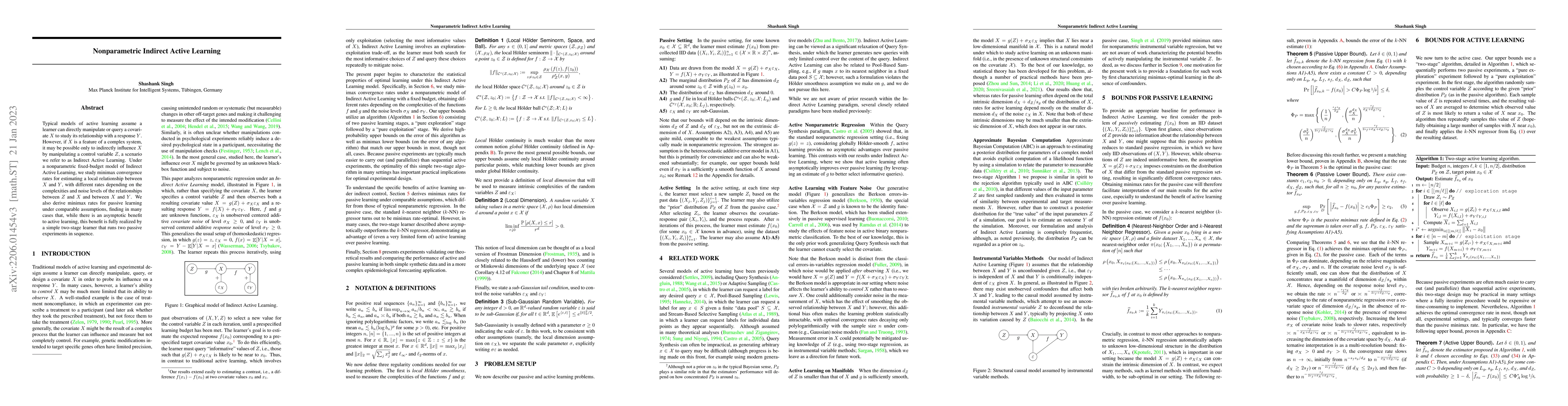 Traditional models of active learning assume a learner can directly manipulate or query a covariate $X$ in order to study its relationship with a response $Y$. However, if $X$ is a feature of a complex system, it may be possible only to indirectly influence $X$ by manipulating a control variable $Z$, a scenario we refer to as Indirect Active Learning. Under a nonparametric model of Indirect Active Learning with a fixed budget, we study minimax convergence rates for estimating the relationship between $X$ and $Y$ locally at a point, obtaining different rates depending on the complexities and noise levels of the relationships between $Z$ and $X$ and between $X$ and $Y$. We also identify minimax rates for passive learning under comparable assumptions. In many cases, our results show that, while there is an asymptotic benefit to active learning, this benefit is fully realized by a simple two-stage learner that runs two passive experiments in sequence.