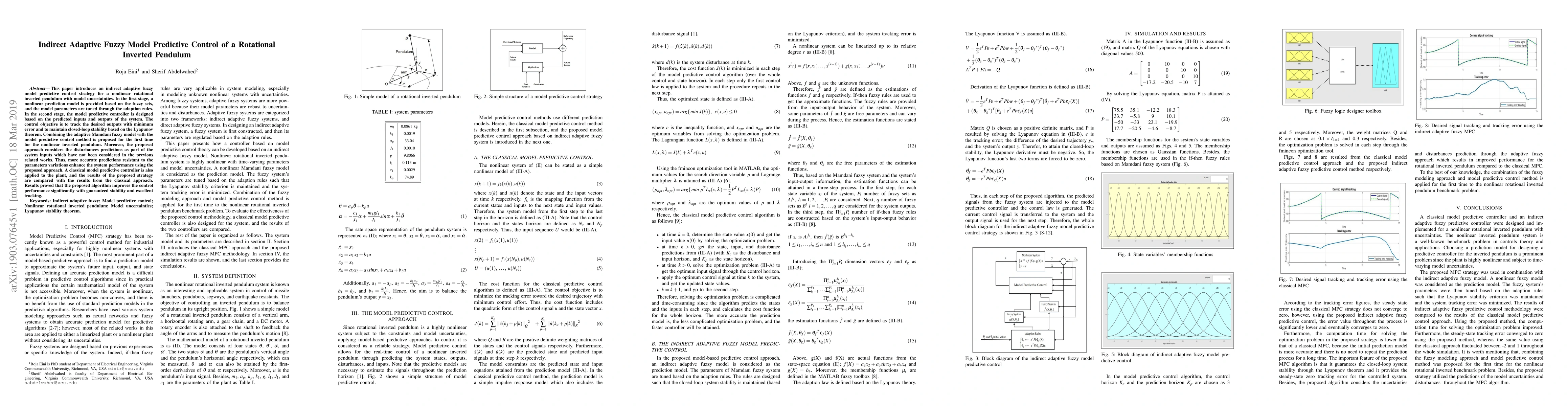 This paper introduces an indirect adaptive fuzzy model predictive control strategy for a nonlinear rotational inverted pendulum with model uncertainties. In the first stage, a nonlinear prediction model is provided based on the fuzzy sets, and the model parameters are tuned through the adaption rules. In the second stage, the model predictive controller is designed based on the predicted inputs and outputs of the system. The control objective is to track the desired outputs with minimum error and to maintain closed-loop stability based on the Lyapunov theorem. Combining the adaptive Mamdani fuzzy model with the model predictive control method is proposed for the first time for the nonlinear inverted pendulum. Moreover, the proposed approach considers the disturbances predictions as part of the system inputs which have not been considered in the previous related works. Thus, more accurate predictions resistant to the parameters variations enhance the system performance using the proposed approach. A classical model predictive controller is also applied to the plant, and the results of the proposed strategy are compared with the results from the classical approach. Results proved that the proposed algorithm improves the control performance significantly with guaranteed stability and excellent tracking. Keywords: Indirect adaptive fuzzy; Model predictive control; Nonlinear rotational inverted pendulum; Model uncertainties; Lyapunov stability theorem.