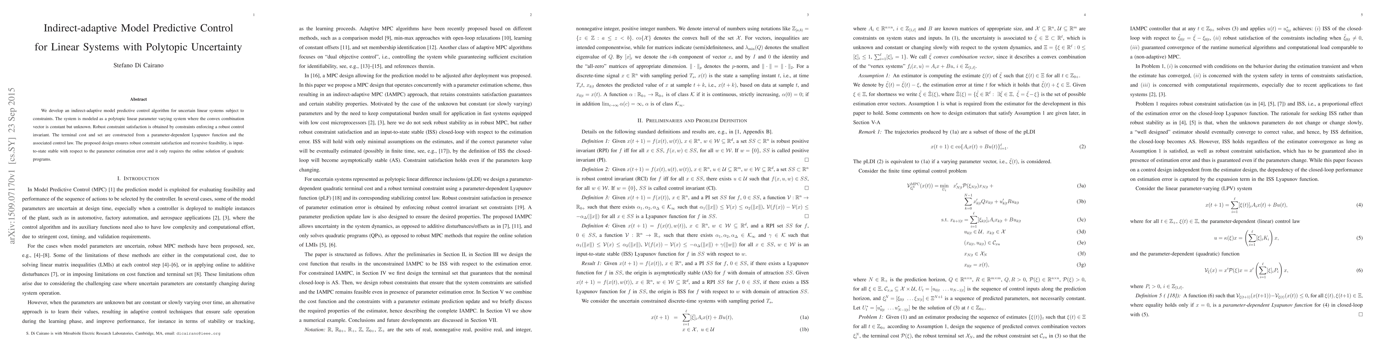 We develop an indirect-adaptive model predictive control algorithm for uncertain linear systems subject to constraints. The system is modeled as a polytopic linear parameter varying system where the convex combination vector is constant but unknown. Robust constraint satisfaction is obtained by constraints enforcing a robust control invariant. The terminal cost and set are constructed from a parameter-dependent Lyapunov function and the associated control law. The proposed design ensures robust constraint satisfaction and recursive feasibility, is input-to-state stable with respect to the parameter estimation error and it only requires the online solution of quadratic programs.