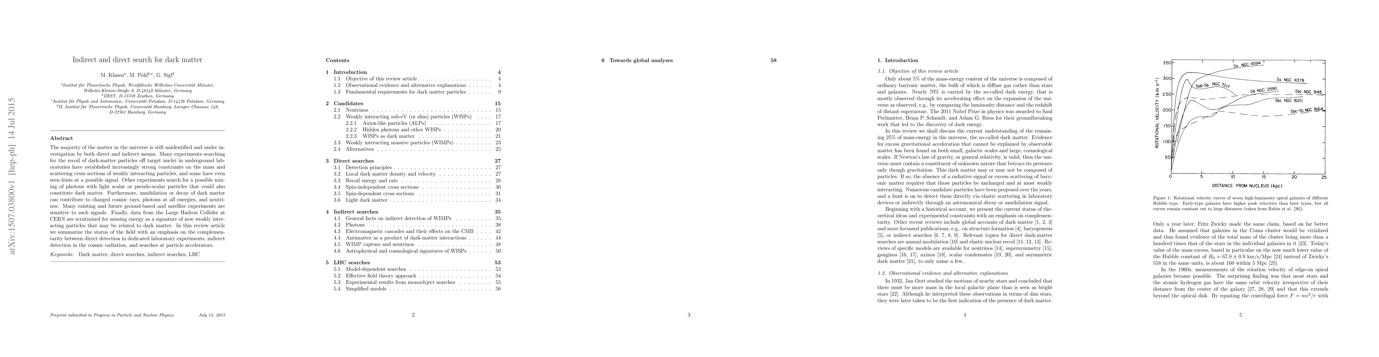 The paper reviews indirect and direct searches for dark matter, discussing experiments in underground laboratories, cosmic ray observations, and particle accelerator data such as the Large Hadron Collider.