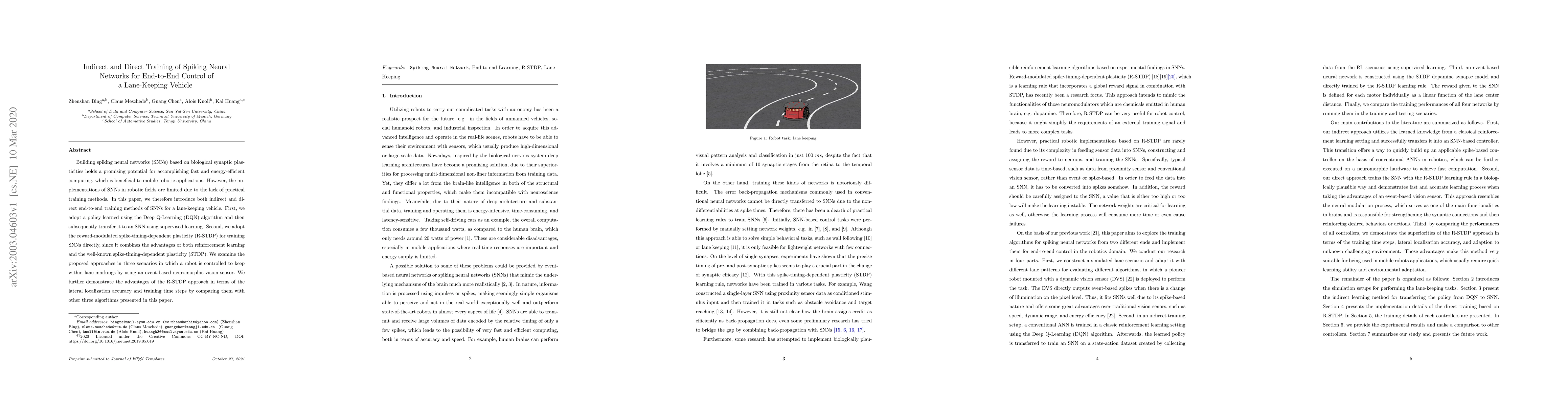 This paper introduces indirect and direct training methods for spiking neural networks (SNNs) to enable end-to-end control of a lane-keeping vehicle. The indirect method uses Deep Q-Learning to train a policy, which is then transferred to an SNN via supervised learning. The direct method employs reward-modulated spike-timing-dependent plasticity (R-STDP) for training SNNs, combining reinforcement learning and STDP advantages, demonstrating superior lateral localization accuracy and reduced training time.