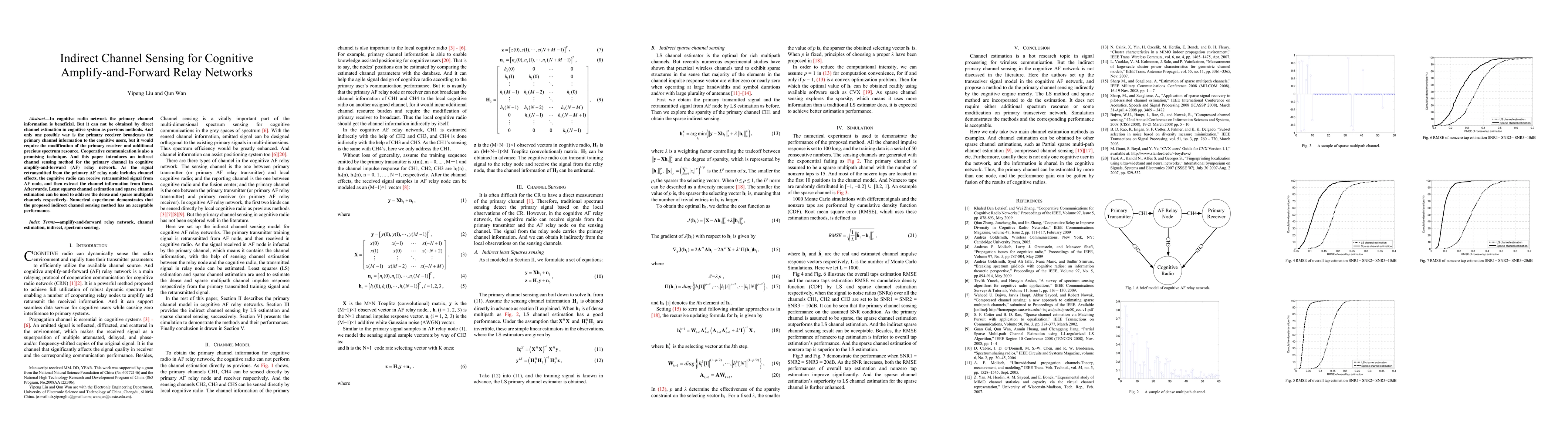 This paper proposes an indirect channel sensing method for cognitive amplify-and-forward relay networks, allowing cognitive radios to extract primary channel information from retransmitted signals without requiring modifications to the primary receiver. The method employs least squares and sparse channel estimation techniques for dense and sparse multipath channels, respectively, demonstrating acceptable performance in numerical experiments.