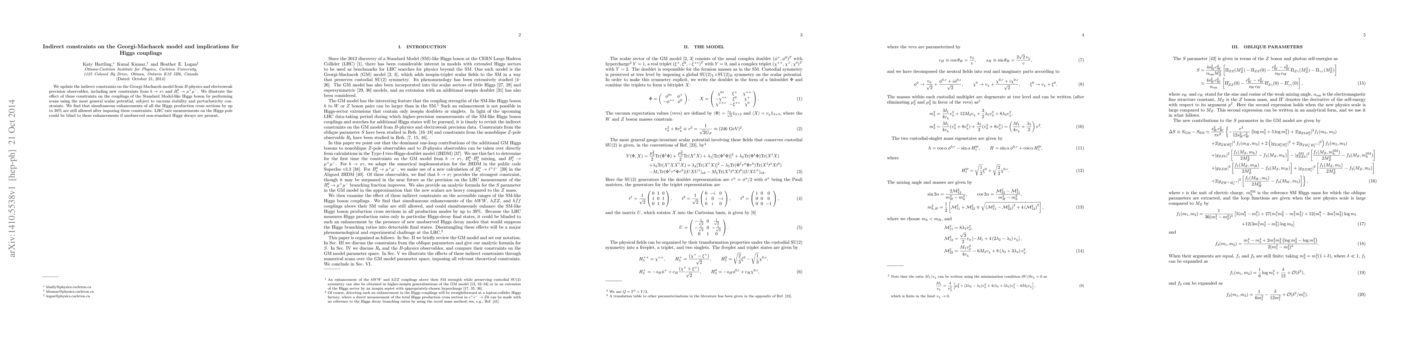 We update the indirect constraints on the Georgi-Machacek model from $B$-physics and electroweak precision observables, including new constraints from $b \to s \gamma$ and $B^0_s \to \mu^+ \mu^-$. We illustrate the effect of these constraints on the couplings of the Standard Model-like Higgs boson by performing scans using the most general scalar potential, subject to vacuum stability and perturbativity constraints. We find that simultaneous enhancements of all the Higgs production cross sections by up to 39\% are still allowed after imposing these constraints. LHC rate measurements on the Higgs pole could be blind to these enhancements if unobserved non-standard Higgs decays are present.