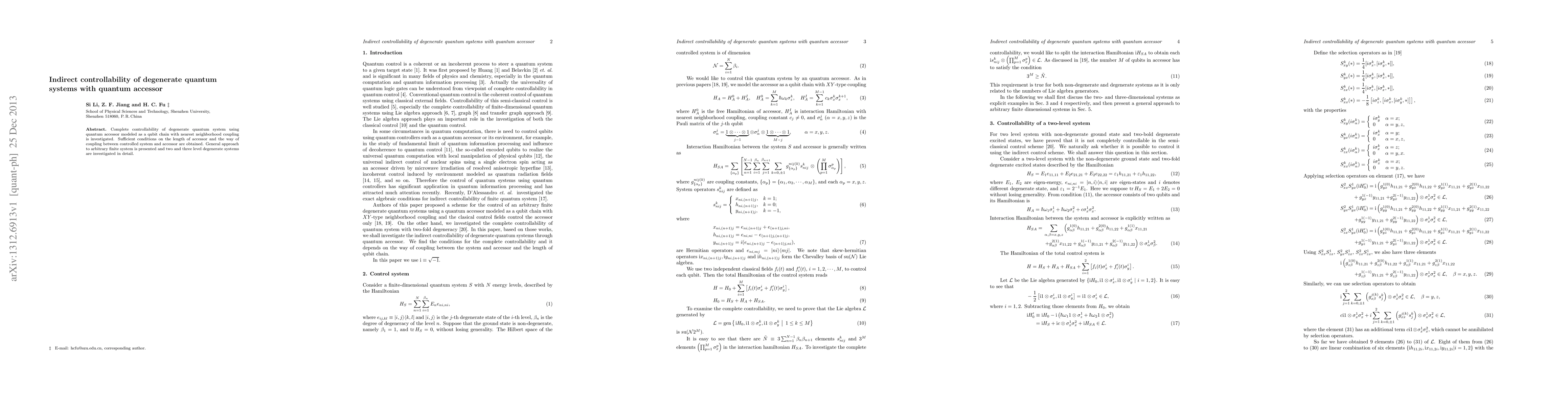 Complete controllability of degenerate quantum system using quantum accessor modeled as a qubit chain with nearest neighborhood coupling is investigated. Sufficient conditions on the length of accessor and the way of coupling between controlled system and accessor are obtained. General approach to arbitrary finite system is presented and two and three level degenerate systems are investigated in detail.