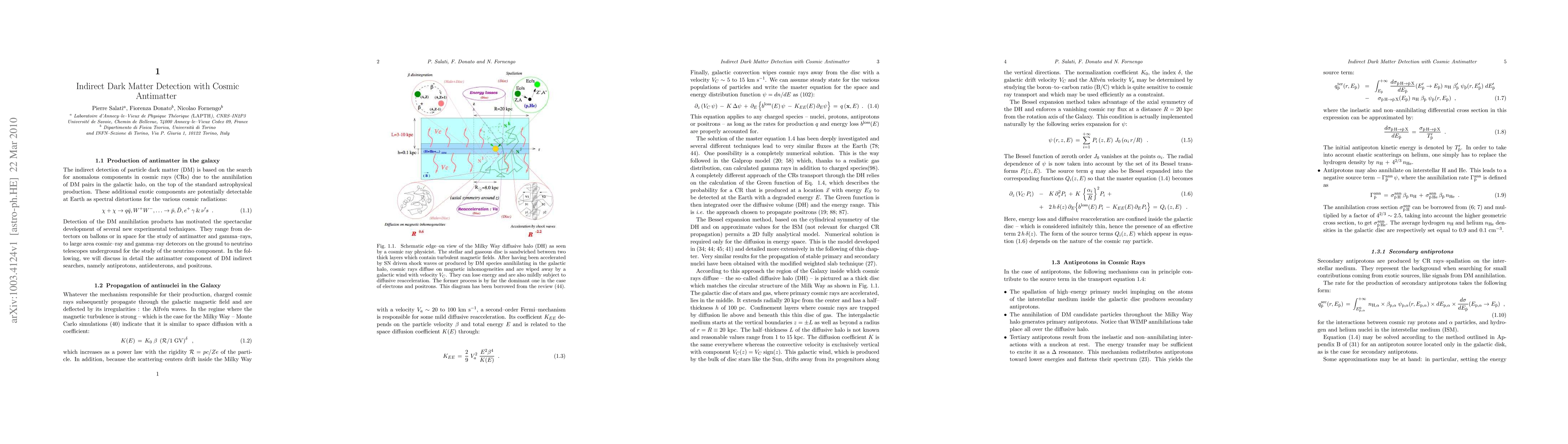 The indirect detection of particle dark matter (DM) is based on the search for anomalous components in cosmic rays (CRs) due to the annihilation of DM pairs in the galactic halo, on the top of the standard astrophysical production. These additional exotic components are potentially detectable at Earth as spectral distortions for the various cosmic radiations: $\chi + \chi \to q \bar{q}, W^+ W^-, ... \to \bar{p}, \bar{D}, e^+ \gamma and \nu's $. Detection of the DM annihilation products has motivated the spectacular development of several new experimental techniques. They range from detectors on ballons or in space for the study of antimatter and gamma-rays, to large area cosmic-ray and gamma-ray detecors on the ground to neutrino telescopes underground for the study of the neutrino component. In the following, we will discuss in detail the antimatter component of DM indirect searches, namely antiprotons, antideuterons, and positrons.