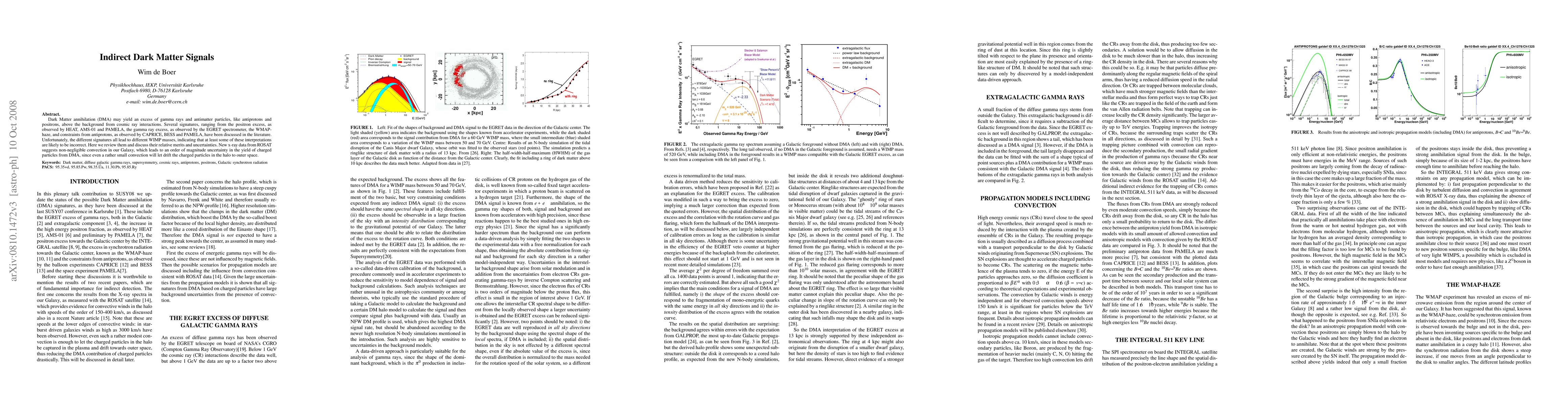 Dark Matter annihilation (DMA) may yield an excess of gamma rays and antimatter particles, like antiprotons and positrons, above the background from cosmic ray interactions. Several signatures, ranging from the positron excess, as observed by HEAT, AMS-01 and PAMELA, the gamma ray excess, as observed by the EGRET spectrometer, the WMAP-haze, and constraints from antiprotons, as observed by CAPRICE, BESS and PAMELA, have been discussed in the literature. Unfortunately, the different signatures all lead to different WIMP masses, indicating that at least some of these interpretations are likely to be incorrect. Here we review them and discuss their relative merits and uncertainties. New x-ray data from ROSAT suggests non-negligible convection in our Galaxy, which leads to an order of magnitude uncertainty in the yield of charged particles from DMA, since even a rather small convection will let drift the charged particles in the halo to outer space.