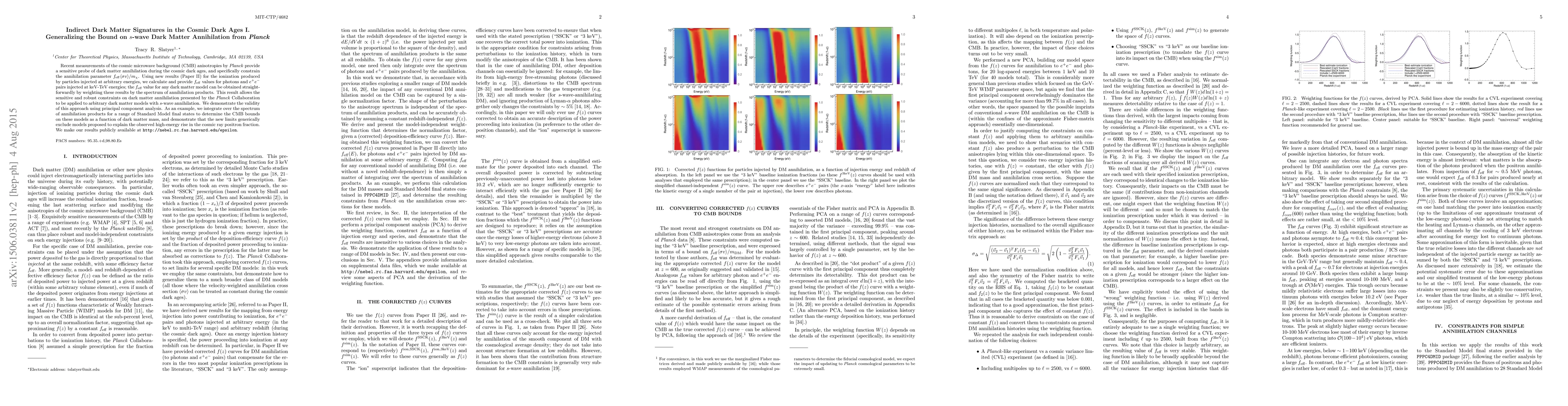 Recent measurements of the cosmic microwave background (CMB) anisotropies by Planck provide a sensitive probe of dark matter annihilation during the cosmic dark ages, and specifically constrain the annihilation parameter $f_\mathrm{eff} \langle \sigma v \rangle/m_\chi$. Using new results (Paper II) for the ionization produced by particles injected at arbitrary energies, we calculate and provide $f_\mathrm{eff}$ values for photons and $e^+e^-$ pairs injected at keV-TeV energies; the $f_\mathrm{eff}$ value for any dark matter model can be obtained straightforwardly by weighting these results by the spectrum of annihilation products. This result allows the sensitive and robust constraints on dark matter annihilation presented by the Planck Collaboration to be applied to arbitrary dark matter models with $s$-wave annihilation. We demonstrate the validity of this approach using principal component analysis. As an example, we integrate over the spectrum of annihilation products for a range of Standard Model final states to determine the CMB bounds on these models as a function of dark matter mass, and demonstrate that the new limits generically exclude models proposed to explain the observed high-energy rise in the cosmic ray positron fraction. We make our results publicly available at http://nebel.rc.fas.harvard.edu/epsilon.