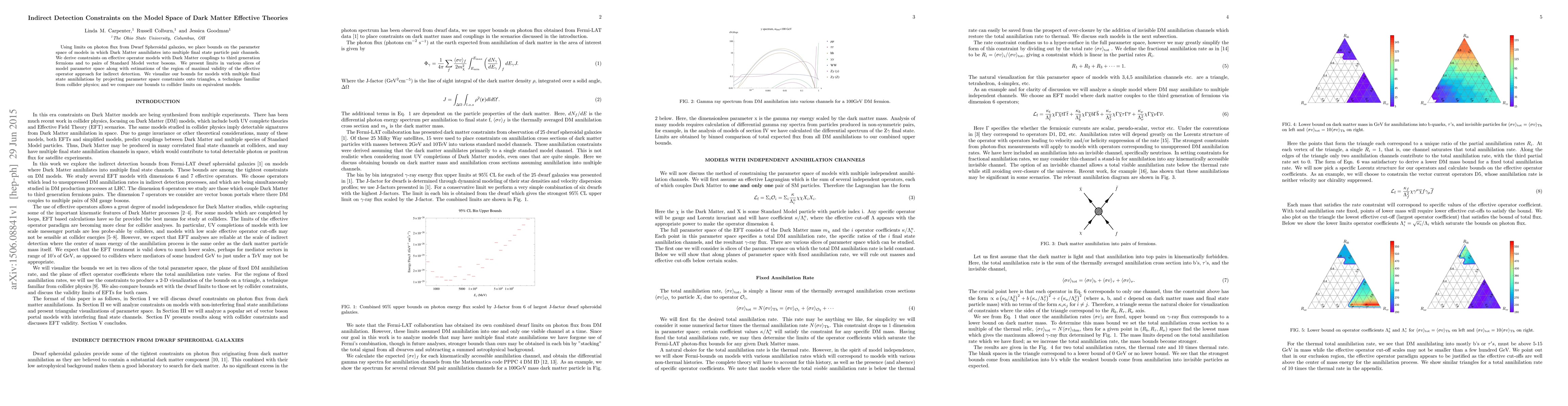Using limits on photon flux from Dwarf Spheroidal galaxies, we place bounds on the parameter space of models in which Dark Matter annihilates into multiple final state particle pair channels. We derive constraints on effective operator models with Dark Matter couplings to third generation fermions and to pairs of Standard Model vector bosons. We present limits in various slices of model parameter space along with estimations of the region of maximal validity of the effective operator approach for indirect detection. We visualize our bounds for models with multiple final state annihilations by projecting parameter space constraints onto triangles, a technique familiar from collider physics; and we compare our bounds to collider limits on equivalent models.