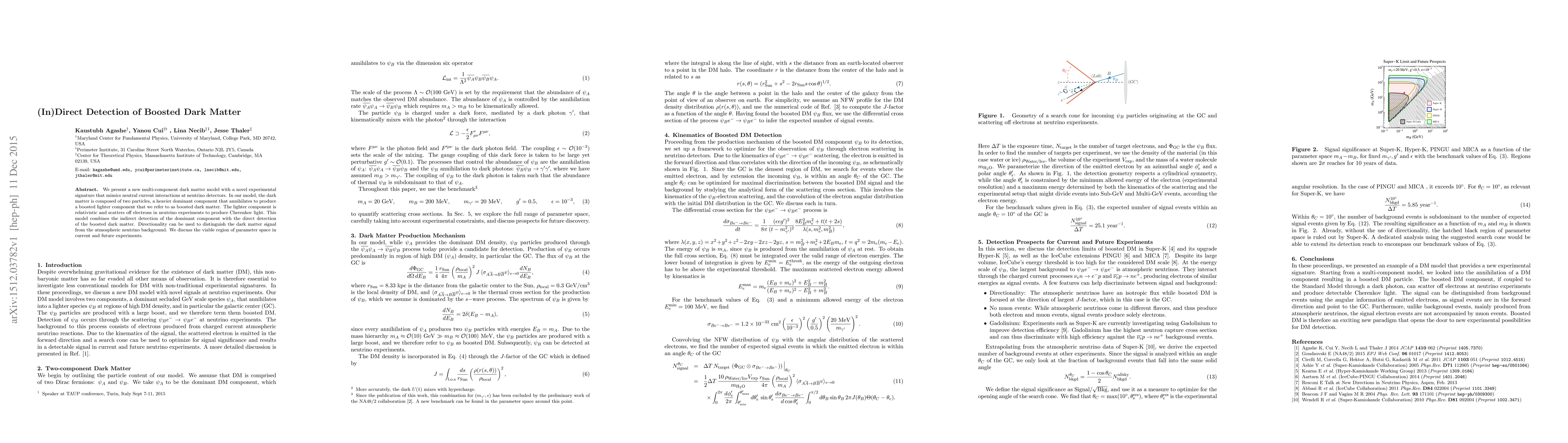 This paper proposes a multi-component dark matter model where a heavier dominant component annihilates to produce relativistic, boosted lighter dark matter. The lighter component scatters off electrons in neutrino detectors, producing Cherenkov light, allowing for both indirect and direct detection. Directionality helps distinguish the signal from atmospheric neutrinos.
