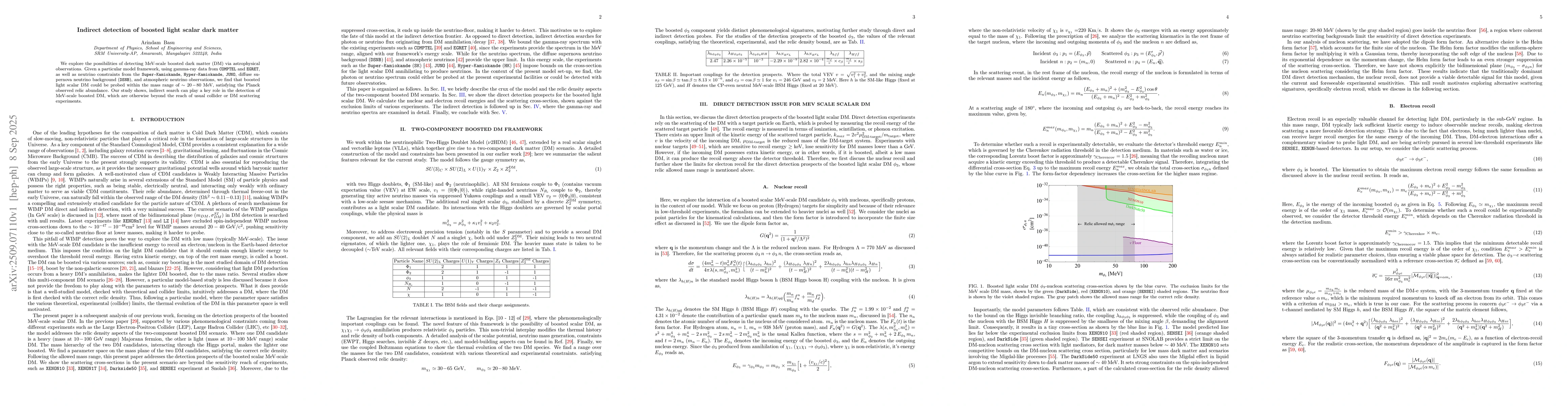 We explore the possibilities of detecting MeV-scale boosted dark matter (DM) via astrophysical observations. Given a particular model framework, using gamma-ray data from \texttt{COMPTEL} and \texttt{EGRET}, as well as neutrino constraints from the \texttt{Super-Kamiokande}, \texttt{Hyper-Kamiokande}, \texttt{JUNO}, diffuse supernova neutrino background (\texttt{DSNB}), and atmospheric neutrino observations, we find that boosted light scalar DM could be probed within the mass range of $\sim 20\!-\!80$ MeV, satisfying the Planck observed relic abundance. Our study shows, indirect search can play a key role in the detection of MeV-scale boosted DM, which are otherwise beyond the reach of usual collider or DM scattering experiments.