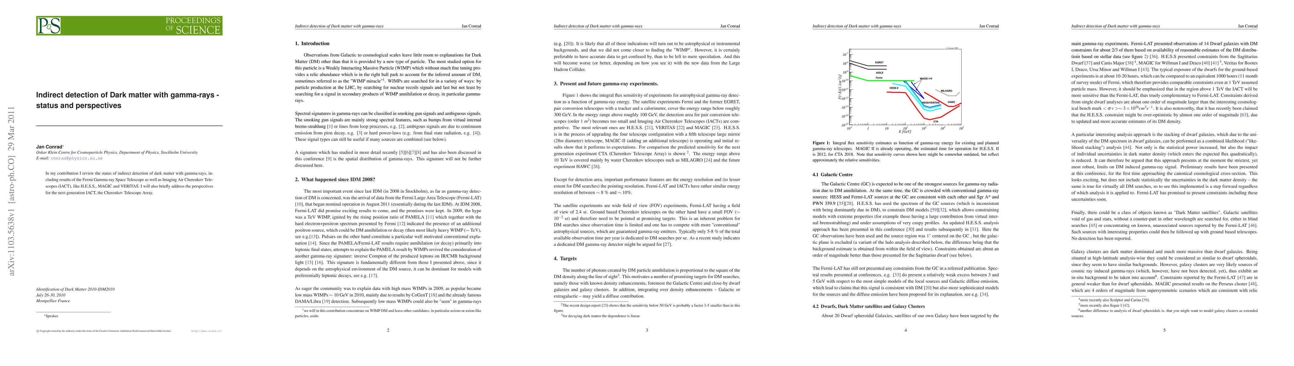 In my contribution I review the status of indirect detection of dark matter with gamma-rays, including results of the Fermi Gamma-ray Space Telescope as well as Imaging Air Cherenkov Telescopes (IACT), like H.E.S.S., MAGIC and VERITAS. I will also briefly address the perspectives for the next generation IACT, the Cherenkov Telescope Array