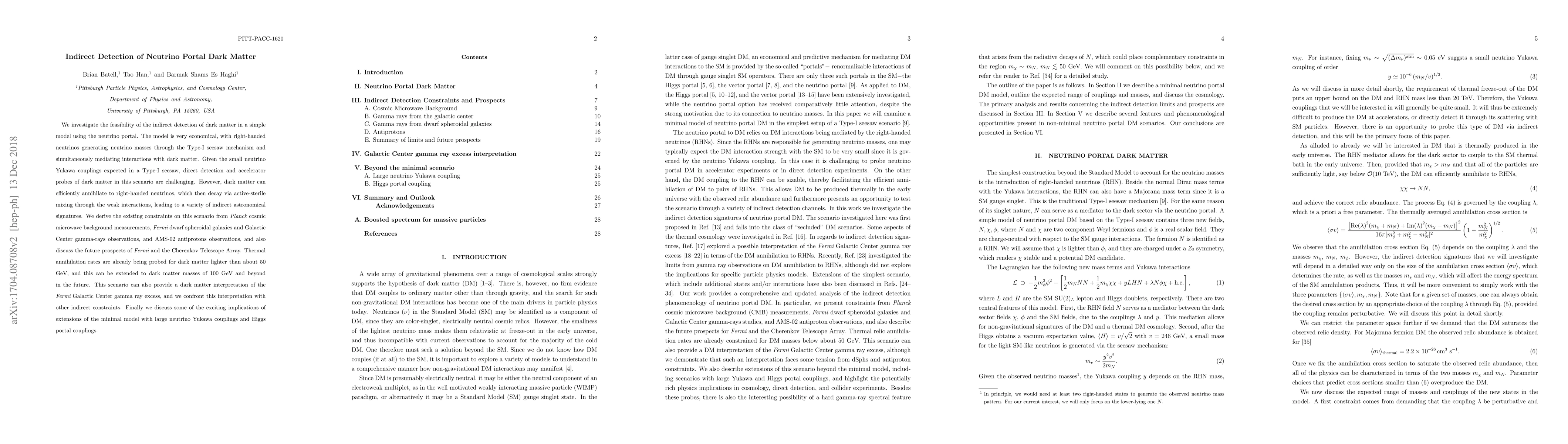 This paper explores the indirect detection of dark matter via the neutrino portal in a simple model where right-handed neutrinos mediate interactions. It examines the annihilation of dark matter into right-handed neutrinos, which decay to produce indirect astronomical signatures, and discusses current and future observational constraints.