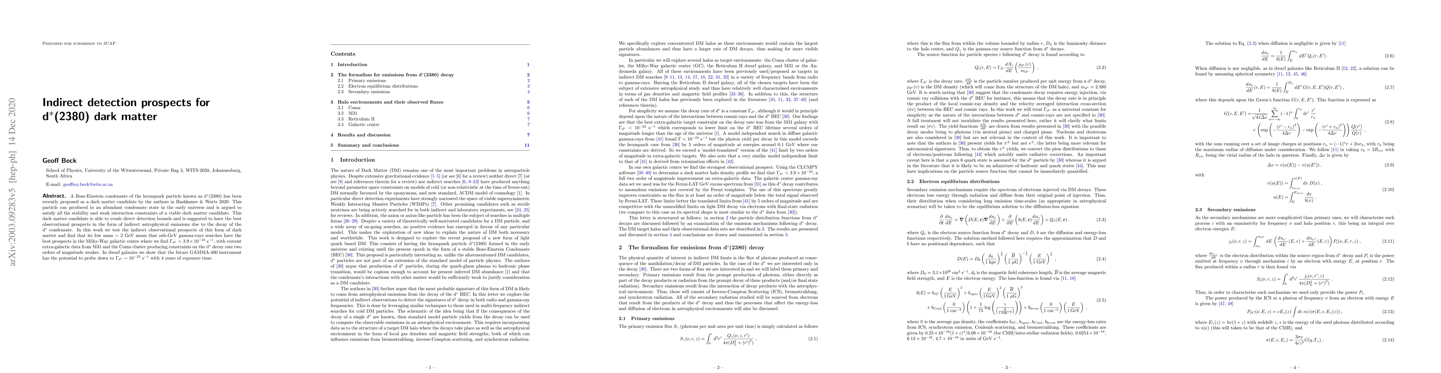 A Bose-Einstein condensate of the hexaquark particle known as d$^*$(2380) has been recently proposed as a dark matter candidate by the authors in Bashkanov \& Watts 2020. This particle can produced in an abundant condensate state in the early universe and is argued to satisfy all the stability and weak interaction constraints of a viable dark matter candidate. This dark matter candidate is able to evade direct detection bounds and is suggested to have the best observational prospects in the form of indirect astrophysical emissions due to the decay of the d$^*$ condensate. In this work we test the indirect observational prospects of this form of dark matter and find that its low mass $\sim 2$ GeV mean that sub-GeV gamma-rays searches have the best prospects in the Milky-Way galactic centre where we find $\Gamma_{d^*} < 3.9 \times 10^{-24}$ s$^{-1}$, with current extra-galactic data from M31 and the Coma cluster producing constraints on the d$^*$ decay rate two orders of magnitude weaker. In dwarf galaxies we show that the future GAMMA-400 instrument has the potential to probe down to $\Gamma_{d^*} \sim 10^{-25}$ s$^{-1}$ with 4 years of exposure time.