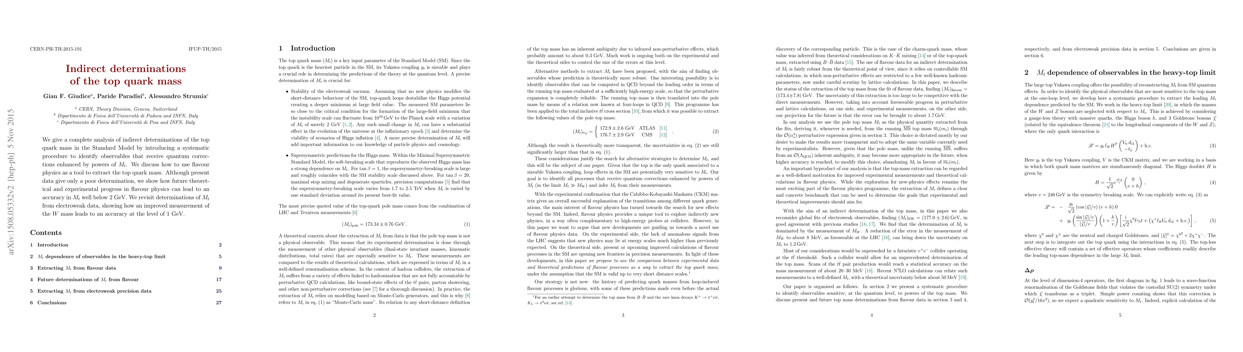 We give a complete analysis of indirect determinations of the top quark mass in the Standard Model by introducing a systematic procedure to identify observables that receive quantum corrections enhanced by powers of $M_t$. We propose to use flavour physics as a tool to extract the top quark mass. Although present data give only a poor determination, we show how future theoretical and experimental progress in flavour physics can lead to an accuracy in $M_t$ well below 2 GeV. We revisit determinations of $M_t$ from electroweak data, showing how an improved measurement of the $W$ mass leads to an accuracy well below 1 GeV.