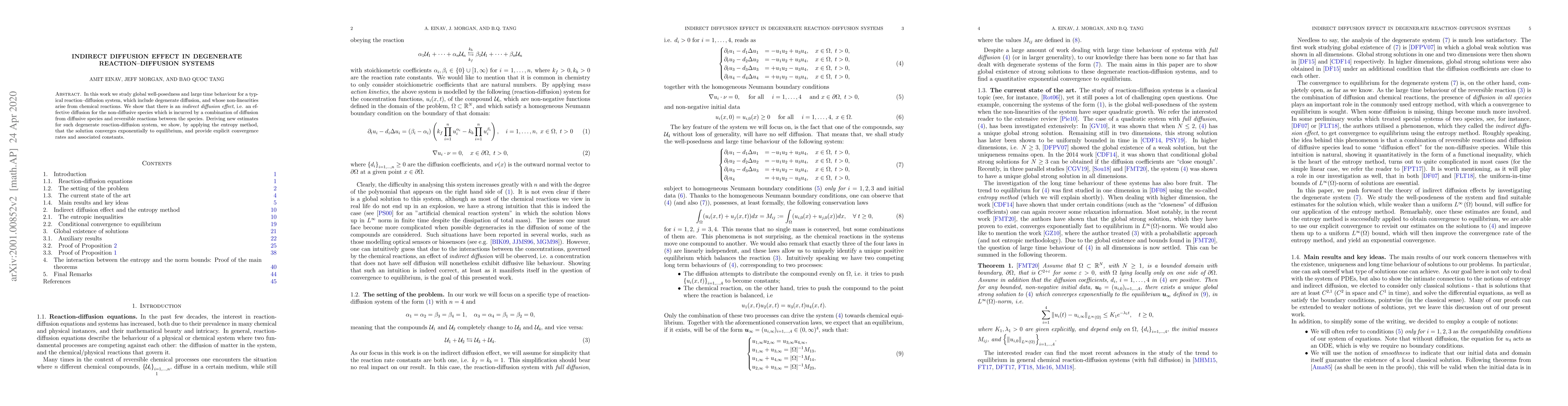 In this work we study global well-posedness and large time behaviour for a typical reaction--diffusion system, which include degenerate diffusion, and whose non-linearities arise from chemical reactions. We show that there is an {\it indirect diffusion effect}, i.e. an effective diffusion for the non-diffusive species which is incurred by a combination of diffusion from diffusive species and reversible reactions between the species. Deriving new estimates for such degenerate reaction-diffusion system, we show, by applying the entropy method, that the solution converges exponentially to equilibrium, and provide explicit convergence rates and associated constants.