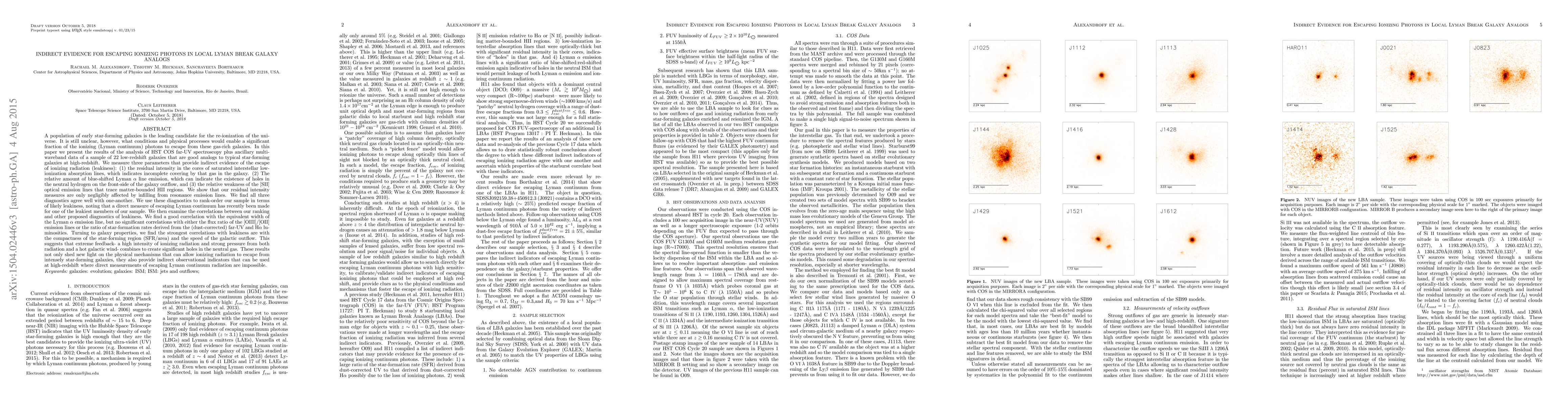 A population of early star-forming galaxies is the leading candidate for the re-ionization of the universe. It is still unclear what conditions and physical processes would enable a significant fraction of the ionizing photons to escape from these gas-rich galaxies. In this paper we present the results of the analysis of HST COS far-UV spectroscopy plus ancillary multi-waveband data of a sample of 22 low-redshift galaxies that are good analogs to typical star-forming galaxies at high-redshift. We measure three parameters that provide indirect evidence of the escape of ionizing radiation: (1) the residual intensity in the cores of saturated interstellar low-ionization absorption-lines. (2) The relative amount of blue-shifted Lyman alpha line emission, and (3) the relative weakness of the [SII] optical emission lines. We use these diagnostics to rank-order our sample in terms of likely leakiness, noting that a direct measure of escaping Lyman continuum has recently been made for one of the leakiest members of our sample. We then examine the correlations between our ranking and other proposed diagnostics of leakiness and find a correlation with the equivalent width of the Lyman alpha emission-line. Turning to galaxy properties, we find the strongest correlations with leakiness are with the compactness of the star-forming region and the speed of the galactic outflow. This suggests that extreme feedback- a high intensity of ionizing radiation and strong pressure from both radiation and a hot galactic wind- combines to create significant holes in the neutral gas. These results not only shed new light on the physical mechanisms that can allow ionizing radiation to escape from intensely star-forming galaxies, they also provide indirect observational indicators that can be used at high-redshift where direct measurements of escaping Lyman continuum radiation are impossible.