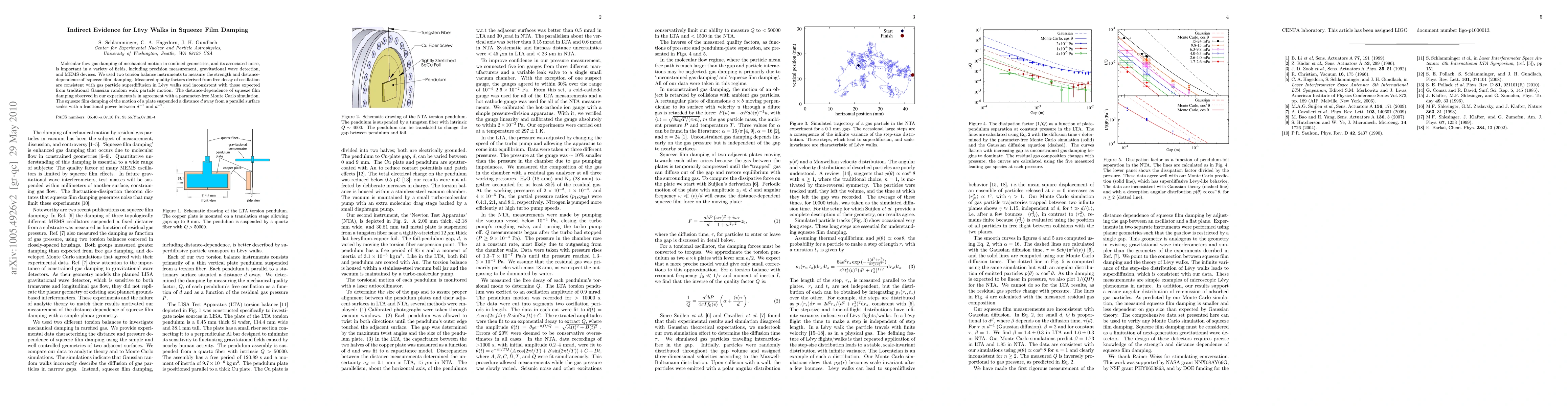 This paper investigates squeeze film damping in confined gas flows using torsion balance instruments, finding evidence supporting superdiffusive L\'evy walk particle motion rather than traditional Gaussian random walk. The observed damping distance-dependence aligns with a parameter-free Monte Carlo simulation.