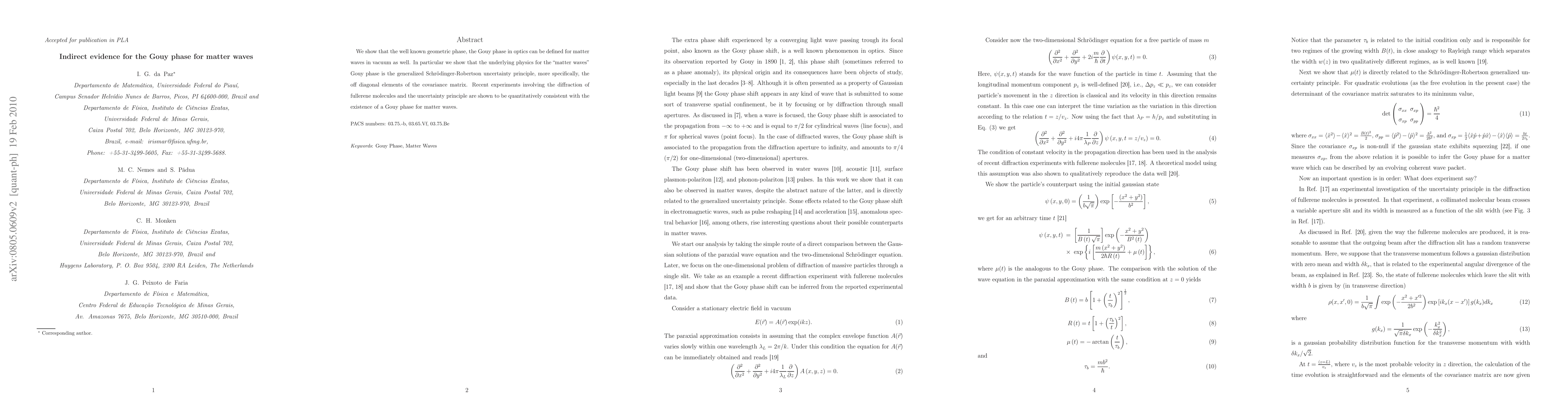 This paper demonstrates the existence of the Gouy phase in matter waves, linking it to the generalized Schrödinger-Robertson uncertainty principle. Experimental evidence from fullerene molecule diffraction supports the theoretical prediction of a Gouy phase for matter waves.