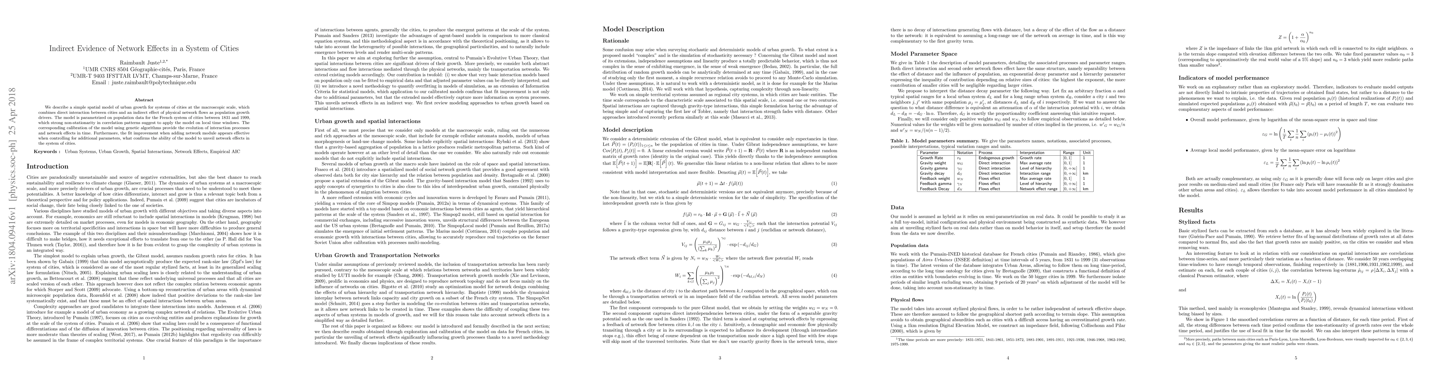 We describe a simple spatial model of urban growth for systems of cities at the macroscopic scale, which combines direct interaction between cities and an indirect effect of physical network flows as population growth drivers. The model is parametrized on population data for the French system of cities between 1831 and 1999, which strong non-stationarity in correlation patterns suggest to apply the model on local time windows. The corresponding calibration of the model using genetic algorithms provide the evolution of interaction processes and network effects in time. Furthermore, the fit improvement when adding network module appears effective when controlling for additional parameters, what confirms the ability of the model to unveil network effects in the system of cities.