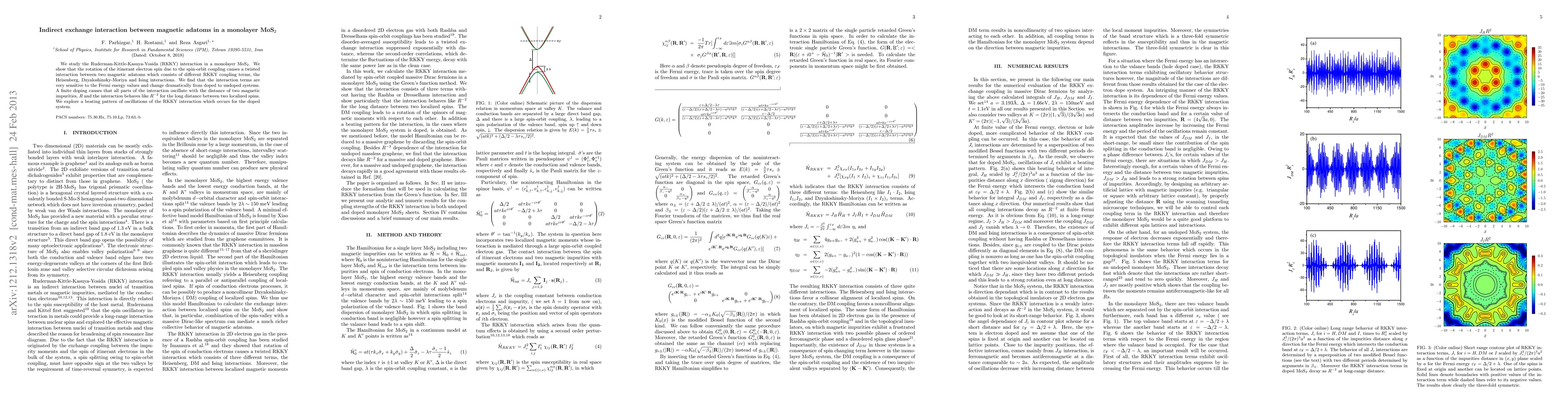 We study the Ruderman-Kittle-Kasuya-Yosida (RKKY) interaction in a monolayer MoS$_2$. We show that the rotation of the itinerant electron spin due to the spin-orbit coupling causes a twisted interaction between two magnetic adatoms which consists of different RKKY coupling terms, the Heisenberg, Dzyaloshinsky-Moriya and Ising interactions. We find that the interaction terms are very sensitive to the Fermi energy values and change dramatically from doped to undoped systems. A finite doping causes that all parts of the interaction oscillate with the distance of two magnetic impurities, $R$ and the interaction behaves like $R^{-2}$ for the long distance between two localized spins. We explore a beating pattern of oscillations of the RKKY interaction which occurs for the doped system.