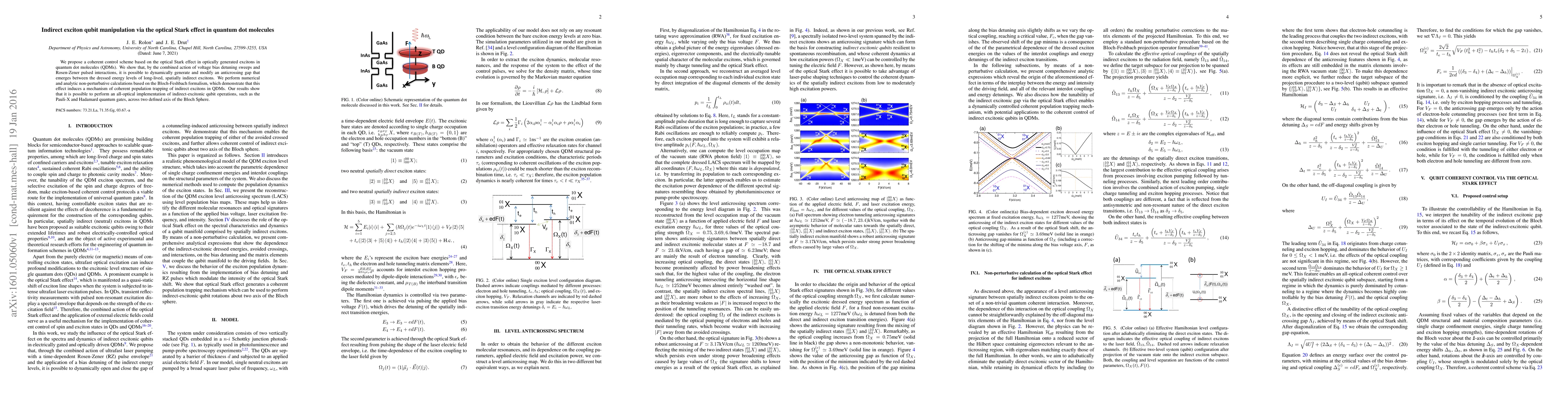 This paper proposes a coherent control scheme using the optical Stark effect to manipulate indirect exciton qubits in quantum dot molecules. By combining voltage bias detuning sweeps and Rosen-Zener pulsed interactions, the authors dynamically generate and modify an anticrossing gap, enabling all-optical implementation of indirect-excitonic qubit operations, including Pauli-X and Hadamard gates.