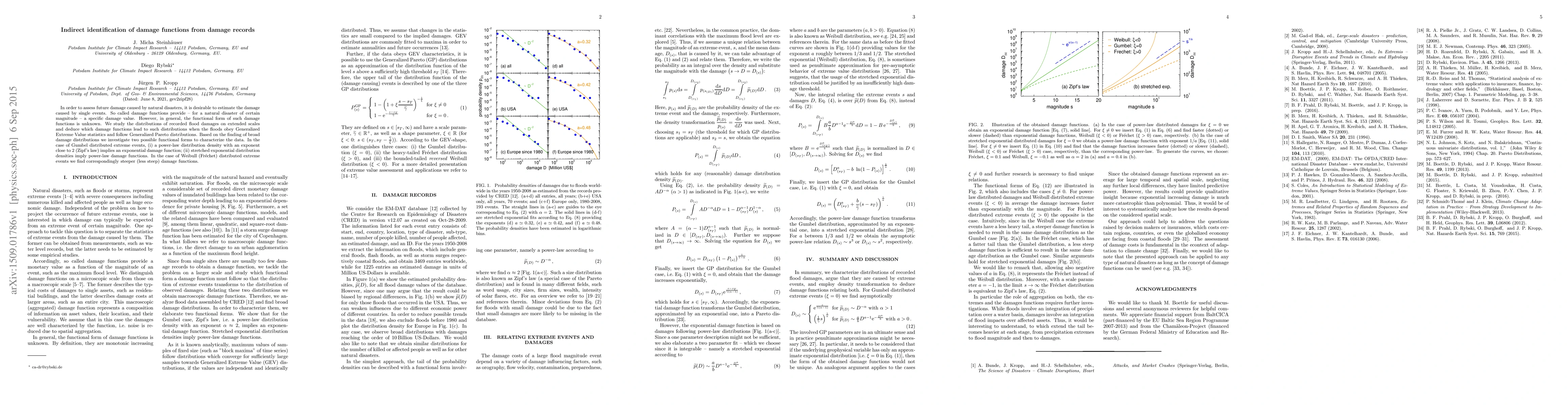This paper investigates the identification of damage functions from recorded flood damage data, focusing on how different statistical distributions of extreme events lead to various forms of damage functions. It finds that under Gumbel distribution, power-law damage functions emerge, while under Weibull distribution, steeper or less steep damage functions are implied.